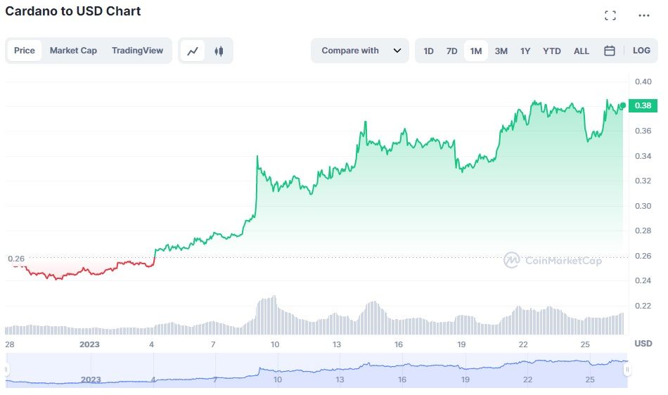 Darüber hinaus legte der Cardano Kurs seit Jahresanfang kontinuierlich zu. Am 1. Januar 2023 notierte der Kurs noch bei etwas unter 0,25 US-Dollar und stieg dann auf aktuell rund 0,38 US-Dollar an – ein Plus von rund 50 %. Allerdings befindet sich Preis immer noch rund 90 % von dem letzten Allzeithoch (3,10 US-Dollar) entfernt.