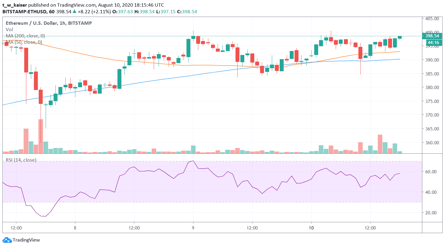 Ethereum hat am Wochenende mehrfach den psychologischen Resistenzbereich bei 400 USD angetestet. Am Sonntag erhielt der Kurs Unterstützung bei 385 USD und nahm von dort an wieder Fahrt auf. Derzeit wird ET für einen Kurs von 398 USD gehandelt.