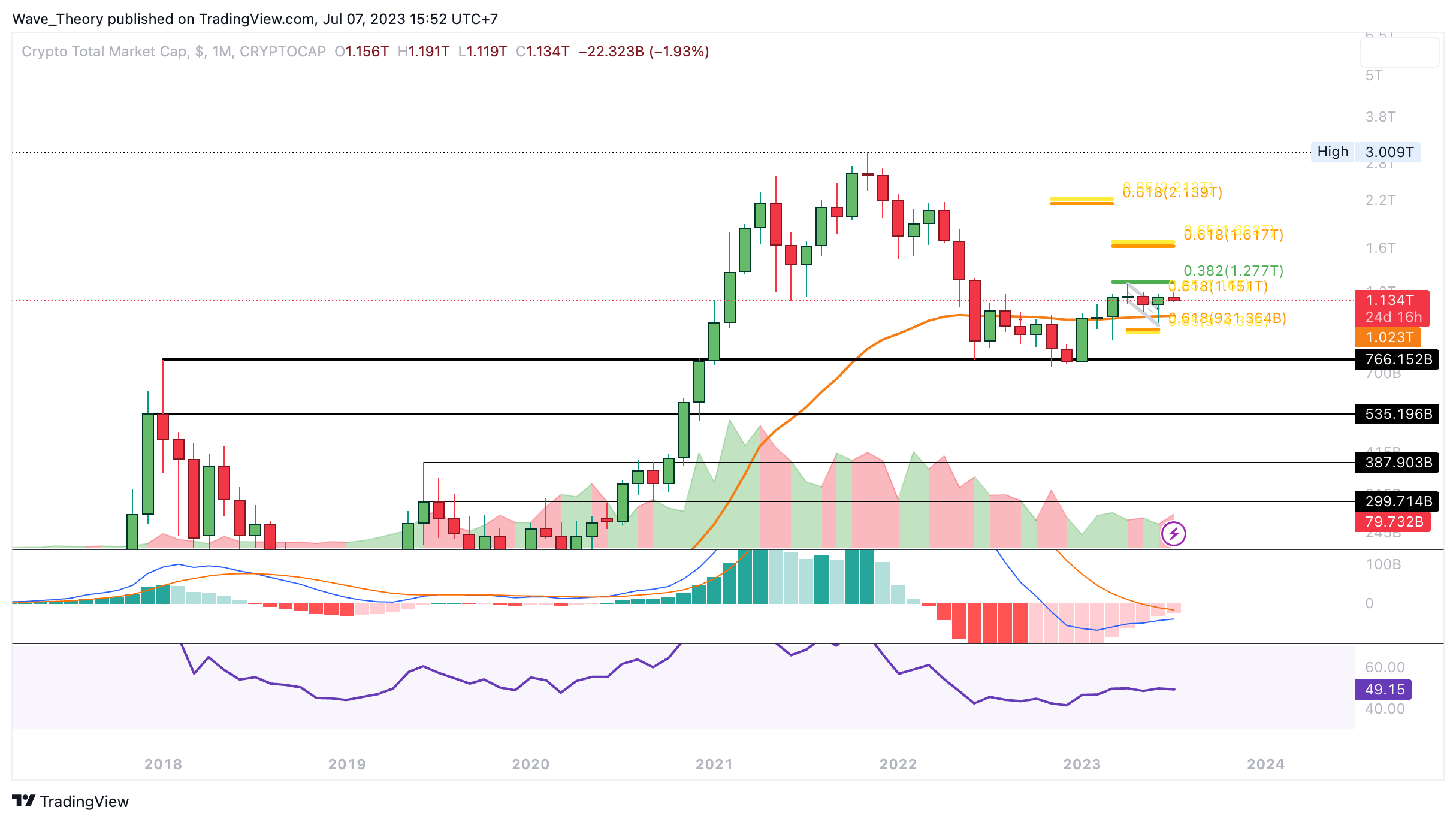 Nach oben hin findet der Krypto-Markt bei rund 1,27 Billionen USD den nächsten signifikanten Fib Widerstand. Wenn der Kurs diesen überwindet, könnte der Kurs zur Golden Ratio bei rund 1,65 Billionen USD steigen. Ansonsten weist das Histogramm des MACDs im Monatschart nach wie vor einen bullischen Trend auf, womit sich auch die MACD Linien bald bullisch überkreuzen könnten.