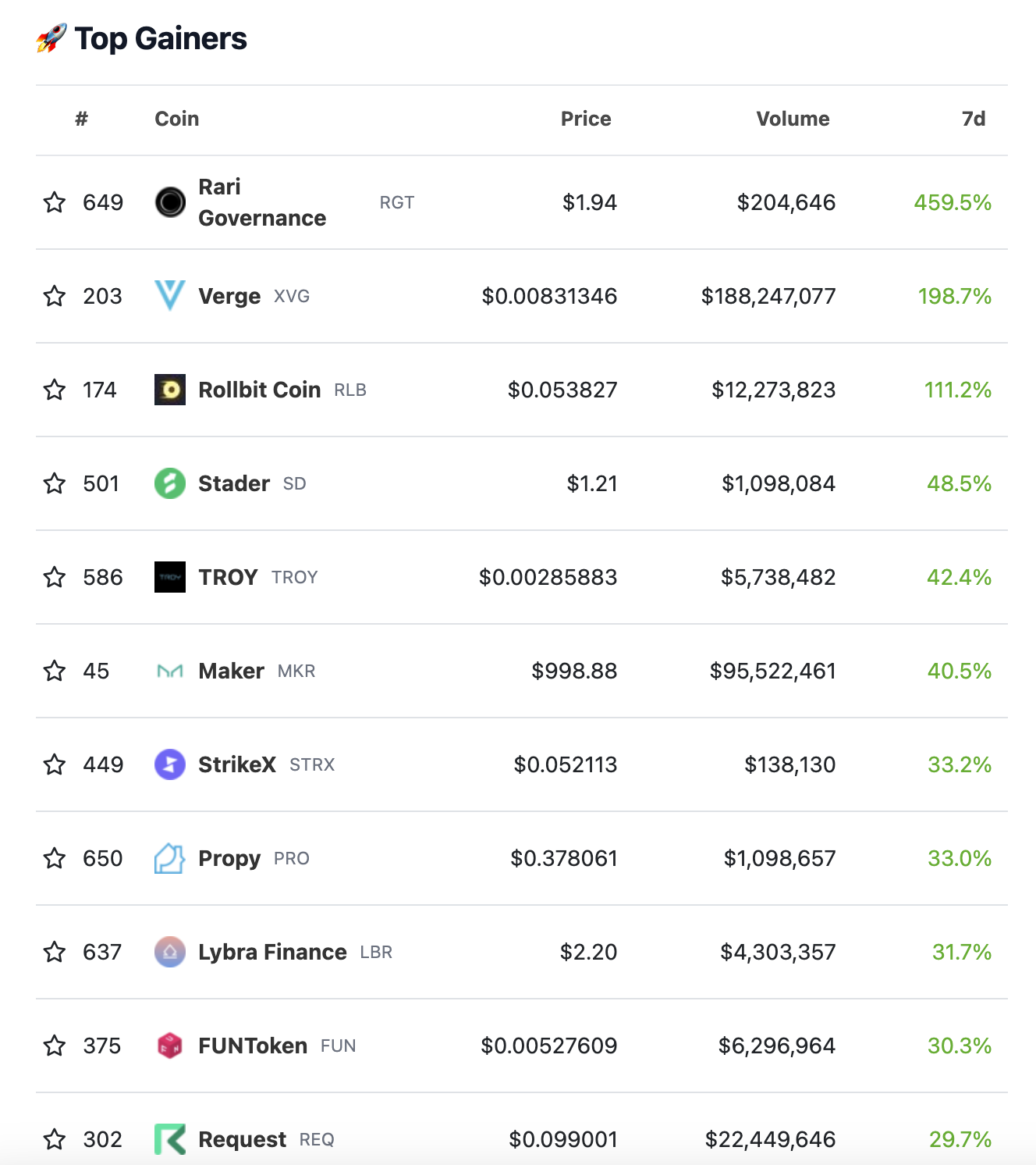 Die zehn Coins mit den stärksten Kursgewinne der letzten sieben Tagen bewegen sich im Bereich von + 30 % und 460 %. Demnach gibt es also nach wie vor starke Kursbewegungen auf dem Krypto-Markt.