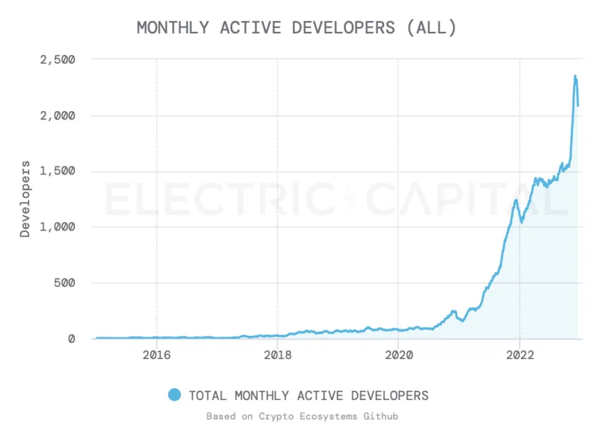 Wie der jüngste Entwicklerbericht von Electric Capital zeigt, verzeichnet das Netzwerk mittlerweile über 2.000 Entwickler – ein Anstieg um 83 % im Vergleich zum Vorjahr. Derzeit schafft nur Ethereum es, diese Zahl zu übertrumpfen.
