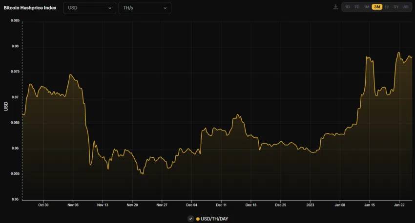 Die Mining-Rentabilität, auch Hash-Preis genannt, erreichte ihr Tief im Dezember. Seit Anfang des Jahres stieg sie laut HashRate Index bereits um ganze 32 % bis auf 0,078 US-Dollar. Die Kennzahl wird in US-Dollar pro Tag und Terahash pro Sekunde (USD/d/TH/s) gemessen.