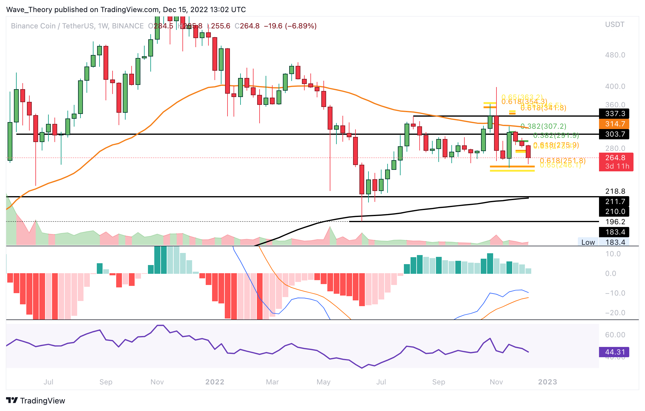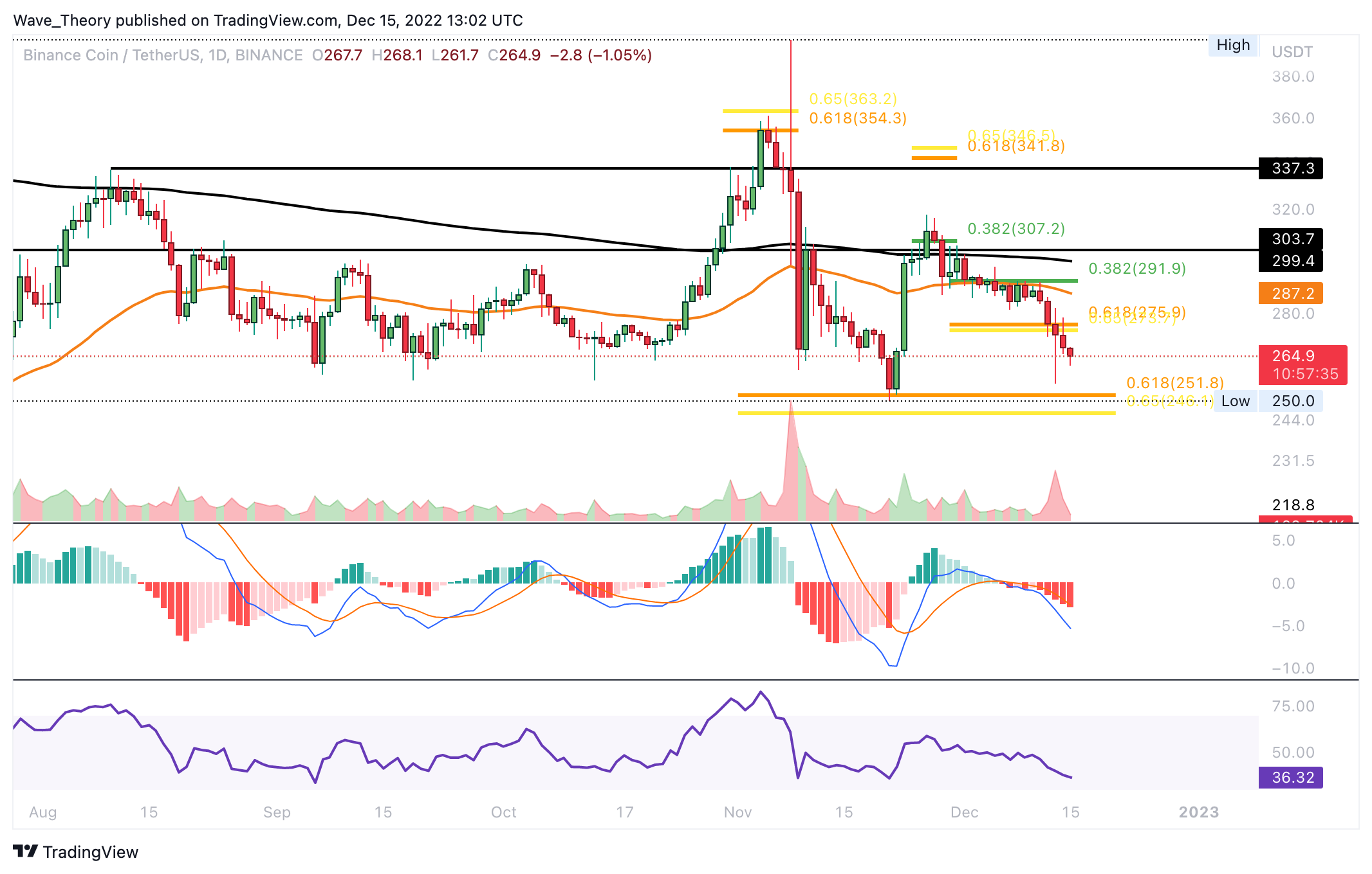 Der BNB Kurs konnte nicht an der Golden Ratio Unterstützung bei rund 275 USD abprallen, sondern durchbrach diese bärisch. Damit findet BNB jetzt bei rund 250 USD die nächste signifikante Fib Unterstützung, woran BNB zuvor sehr heftig abprallen konnte.