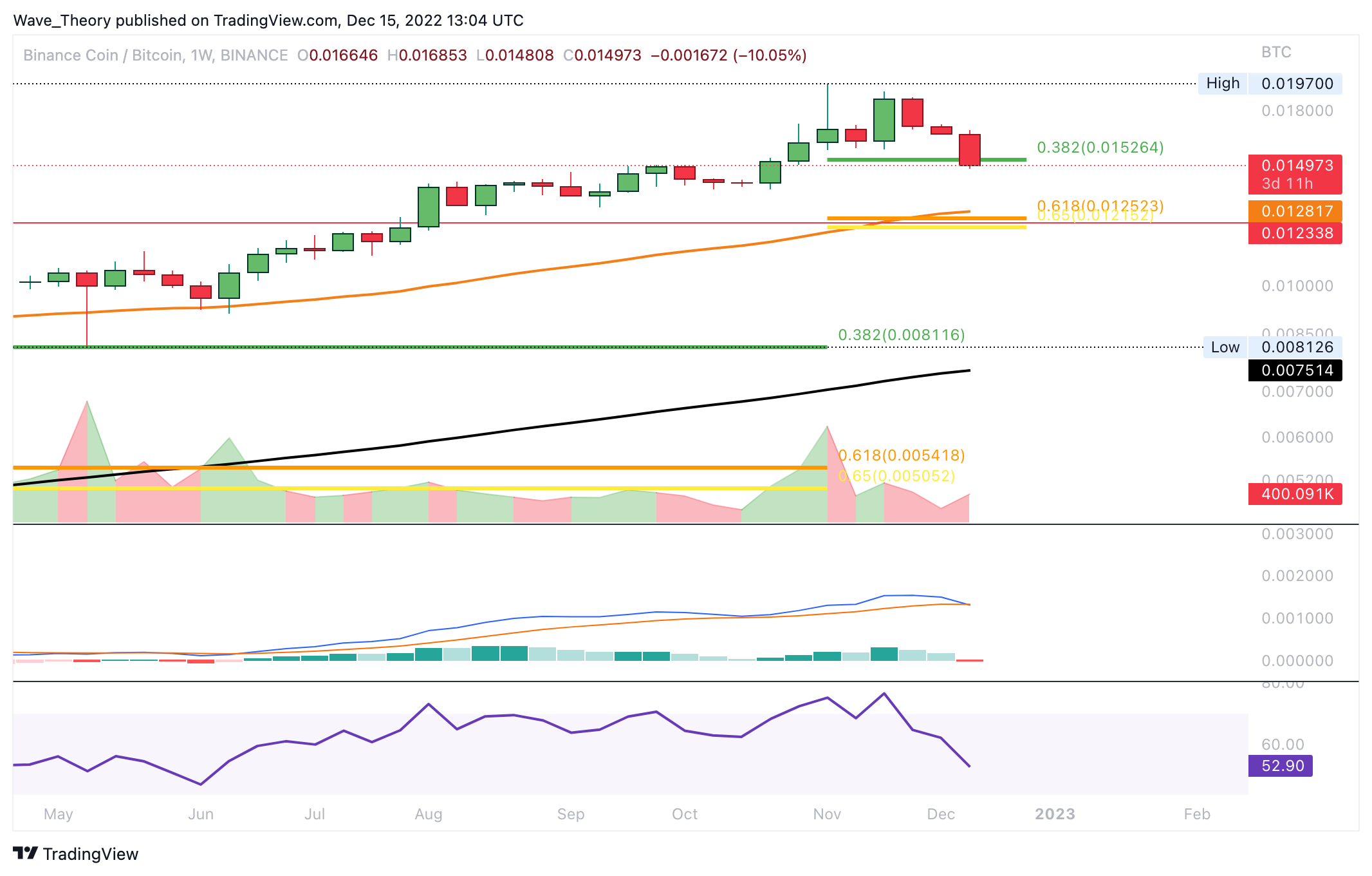 Sollte sie bärisch gebrochen werden, findet BNB bei rund 0,0125 BTC die nächste signifikante Fibonacci Unterstützung. Dort eilt zudem der 50-Wochen-EMA zu Hilfe. Ansonsten tickt das Histogramm des MACDs im Wochenchart bärisch tiefer und die MACD Linien sind gerade dabei sich bärisch zu überkreuzen.