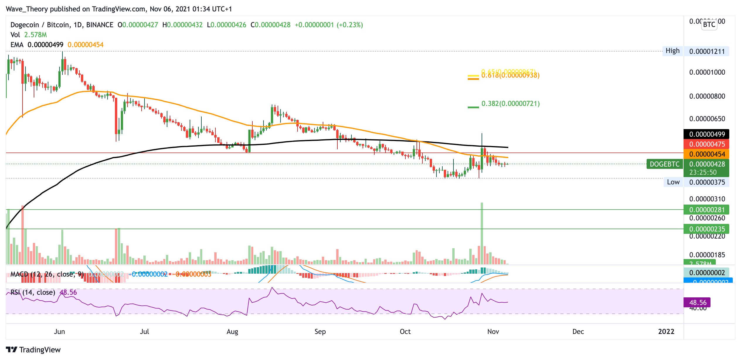 Gegen Bitcoin hingegen sind die EMAs bärisch überkreuzt. Auch der MACD zeigt sich hier eher bärisch. Bei 0,0000072 BTC und 0,0000094 BTC stößt der DOGE Kurs auf starken Fibonacci Widerstand. Zwischen 0,000000235 – 0,00000028 BTC stößt der DOGE Preis auf starke Unterstützung.