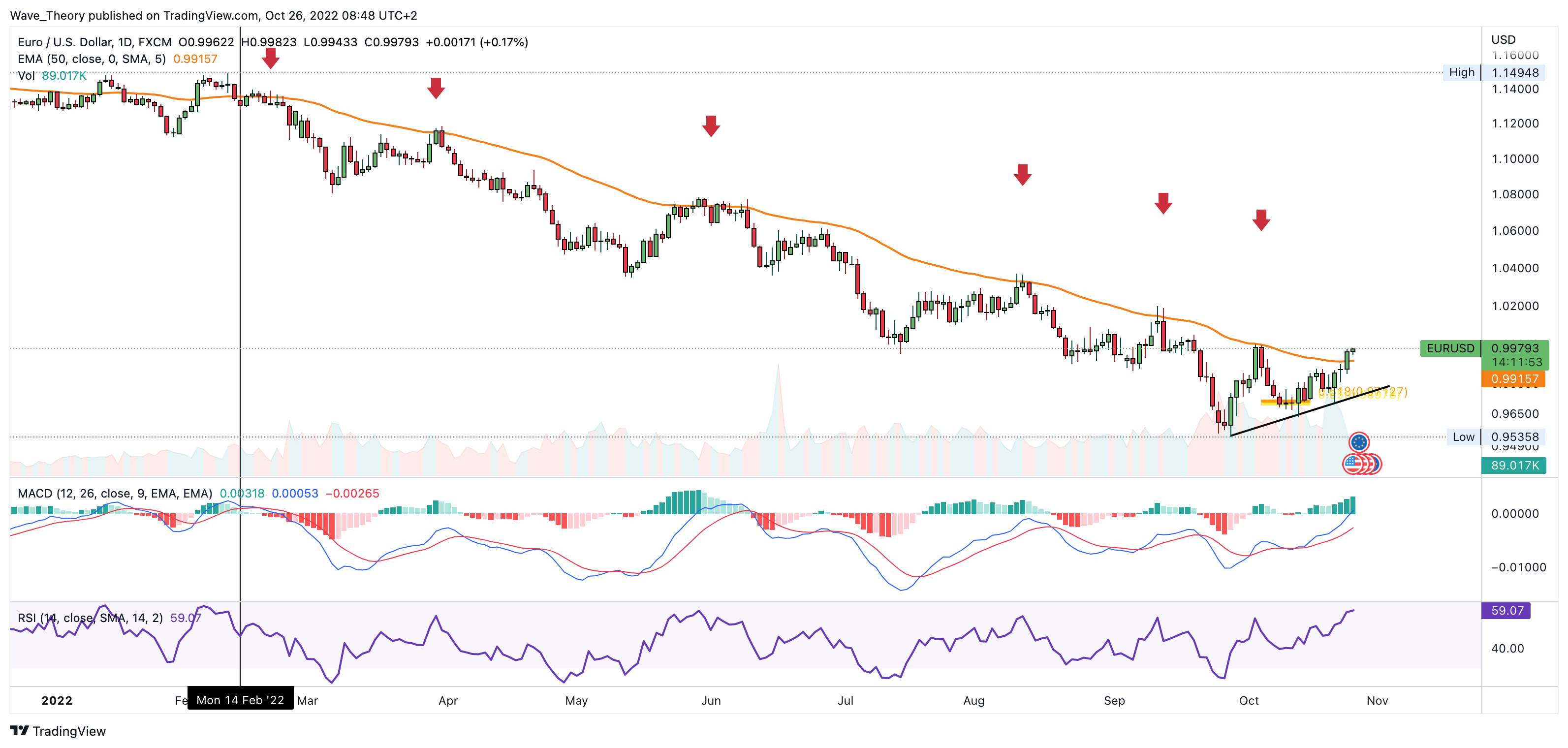 Lediglich der RSI gibt ein bullisches Signal, denn der RSI erreicht nun bald überverkaufte Regionen und befindet sich jetzt an starker Unterstützung, woran der EURO Preis abprallen könnte.