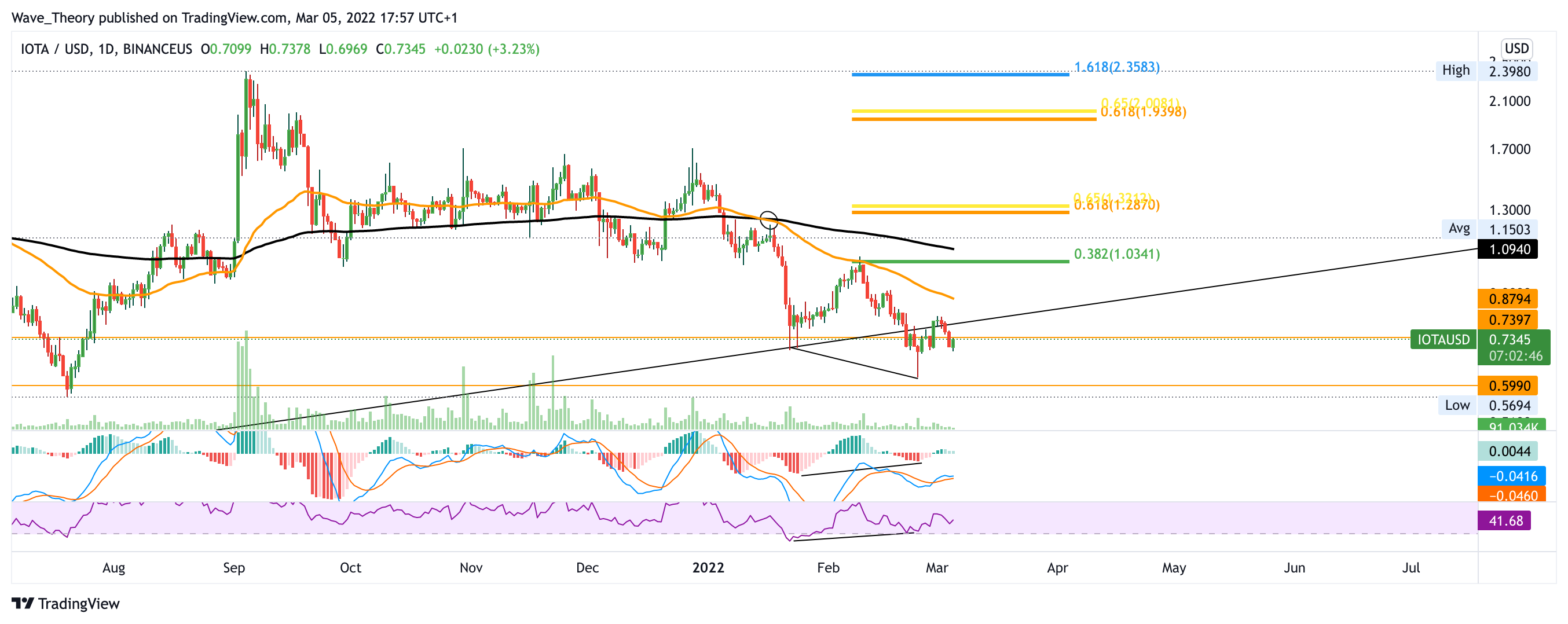 Der IOTA Kurs ist an historischer Unterstützung angekommen, woran er bereits abzuprallen scheint. Zwischen 0,6 – 0,74 USD stößt der IOTA Kurs auf sehr starke Unterstützung und sollte IOTA seine Aufwärtsbewegung fortsetzen, stößt er bereits bei rund 1 USD und 1,3 USD auf signifikante Fibonacci Widerstände. Zudem liegt bei rund 1 USD der 50-Wochen-EMA, welcher zusätzlich am 0,382 Fib Niveau als Widerstand fungiert. Das Histogramm des MACDs zeigt sich seit einigen Wochen zum ersten Mal bullisch, denn es tickt diese Woche bullisch höher. Jedoch hängt dies auch noch vom morgigen Tag ab, denn erst dann schließt die Wochenkerze.