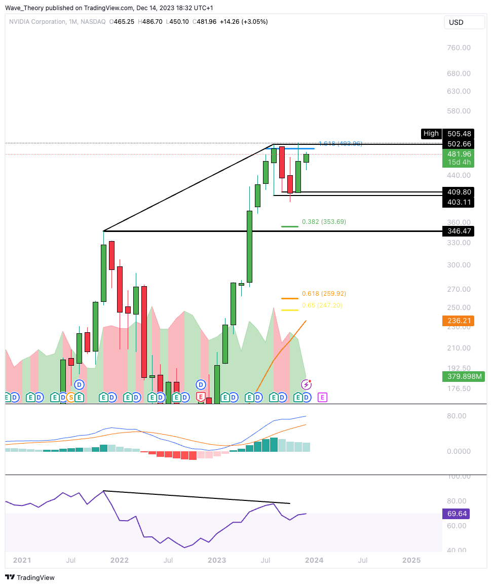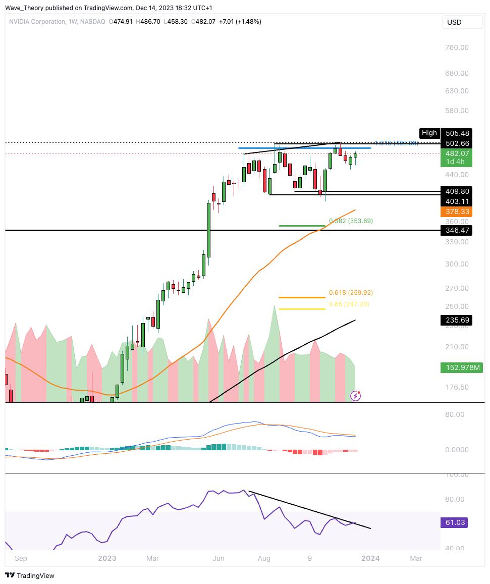 Wird der Nvidia Kurs den wichtigen Fib Widerstand an der 500 USD Marke brechen können? Oder folgt erneut eine bärische Ablehnung?