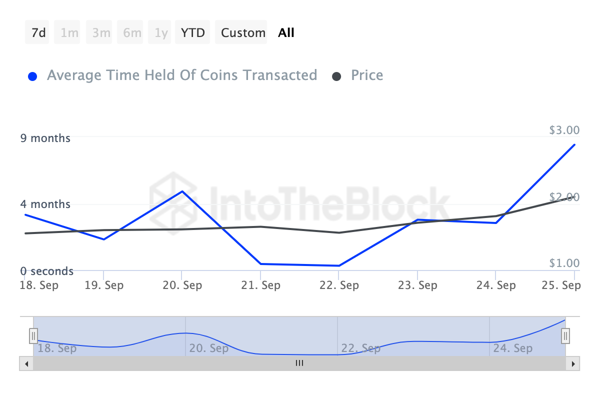 Darüber hinaus ist die Haltezeit der Coins in den letzten sieben Tagen um 310 Prozent gestiegen. Die Haltezeit der Coins misst, wie lange eine Kryptowährung gehalten wurde, ohne verkauft zu werden.