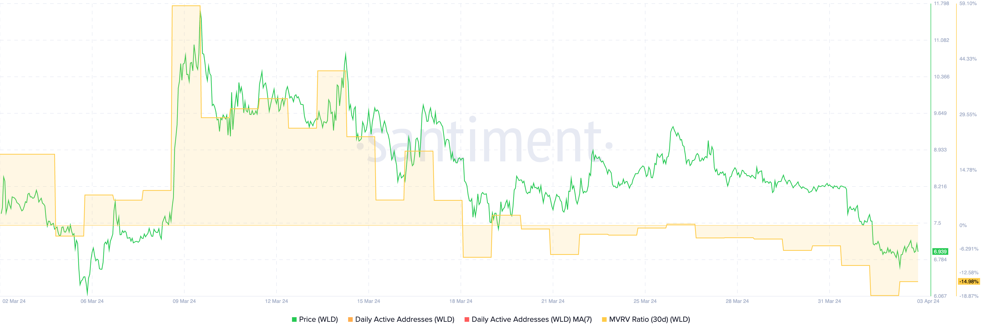 Momentan befindet sich WorldCoin in einer misslichen Lage, was der deutliche Fall des 30-Tage-MVRV-Verhältnisses auf -14,98 Prozent bestätigt. Obwohl ein solcher Rückgang oft eine Unterbewertung anzeigt und eine mögliche Kurssteigerung vorhersagen könnte, legen die momentanen Markttrends nahe, dass sich die Situation anders entwickeln könnte.