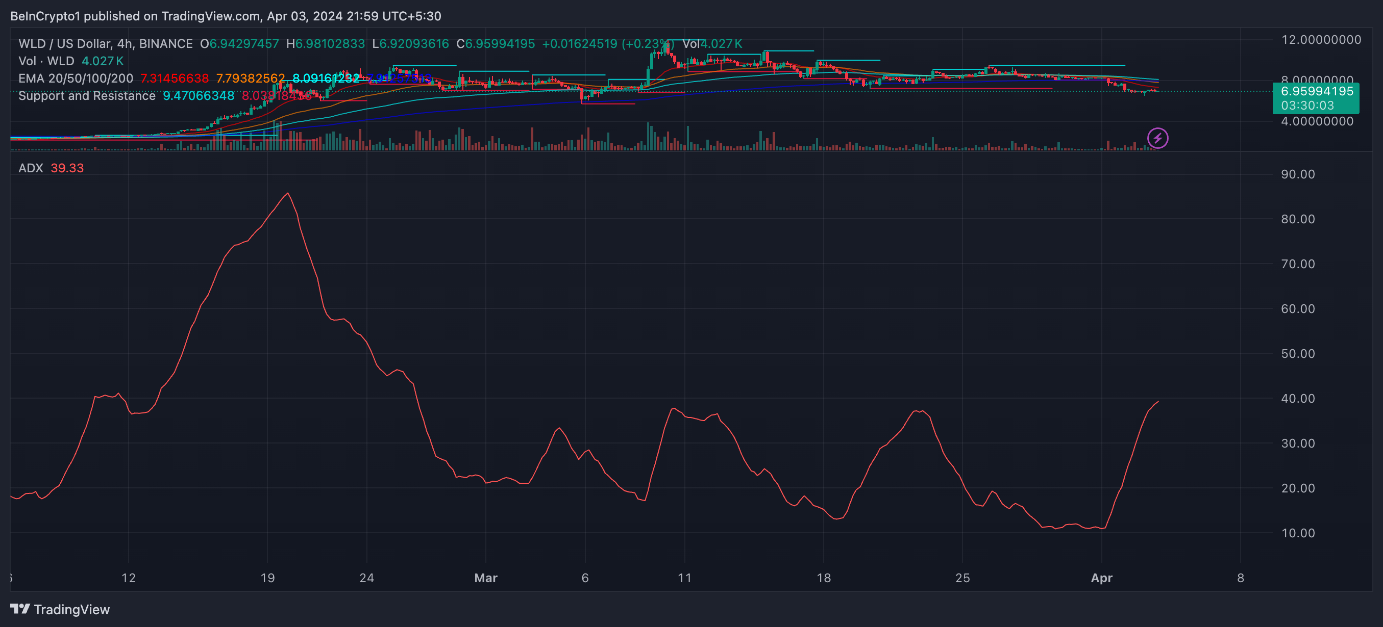 Zudem zeigte der Average Directional Index (ADX) für WorldCoin einen steilen Anstieg von 11,06 am 1. April auf 39,4 am 3. April, was eine signifikante Veränderung in der Marktdynamik signalisiert.