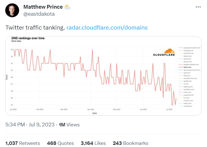 Laut Domain Name System (DNS)-Ranking lag Twitter im Januar 2023 auf Platz 32, mittlerweile liegt er bei etwa 40. Unterdessen erreichte Metas “Threads” in weniger als einer Woche 100 Millionen Nutzungen. Twitter hat damit gedroht, Meta wegen Threads zu verklagen.