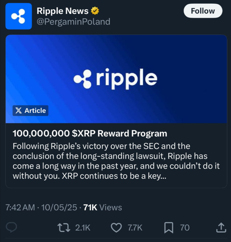 Der Inhalt dieser Betrügereien ist ziemlich konsistent geblieben. Ein verifiziertes X-Konto mit einem goldenen Authentizitäts-Häkchen würde eine “Mitteilung” über den angeblichen XRP-Airdrop posten.