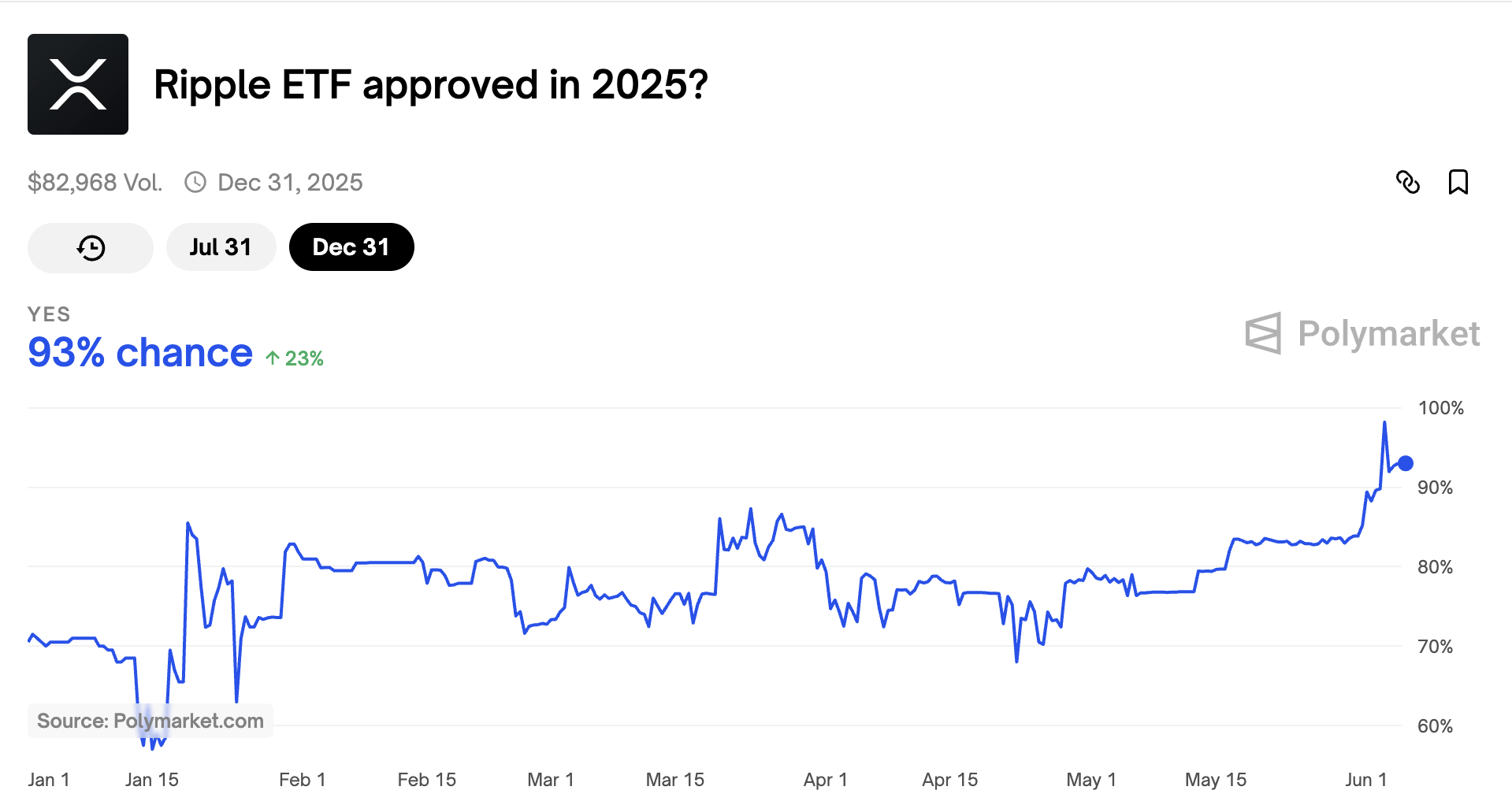 Trotz dieser Herausforderungen bleibt die langfristige Stimmung überwältigend positiv. Aktuell liegen die Chancen auf eine XRP-ETF-Genehmigung bis Dezember 2025 bei 93 Prozent. Sie hatten gestern bei 98 Prozent gelegen.