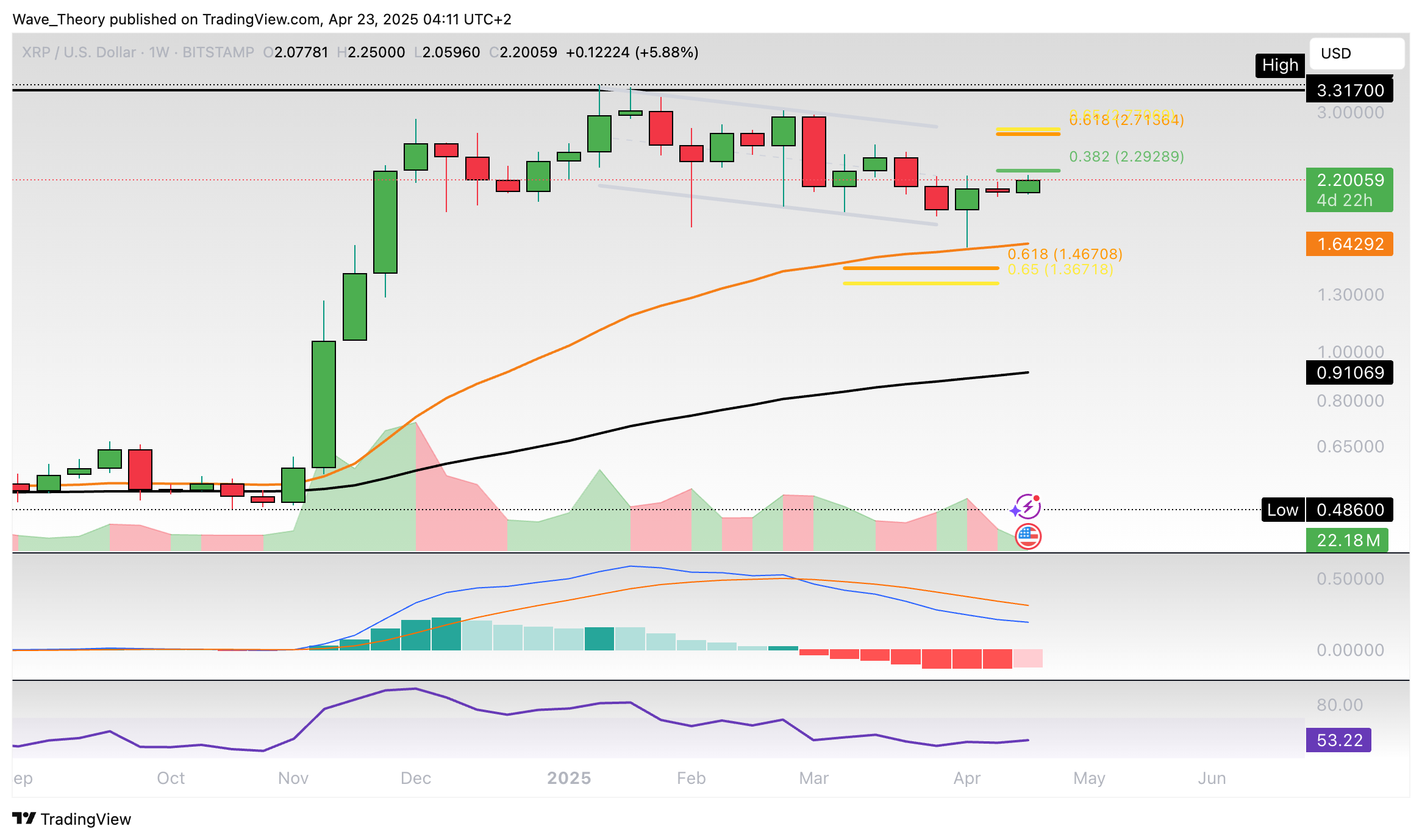 Denn XRP konnte vorletzte Woche am 50-Wochen-EMA bei rund 1,62 USD bullisch abprallen. Dabei ist er auf den Weg den 0,382 Fib Widerstand bei rund 2,29 USD zu erreichen.