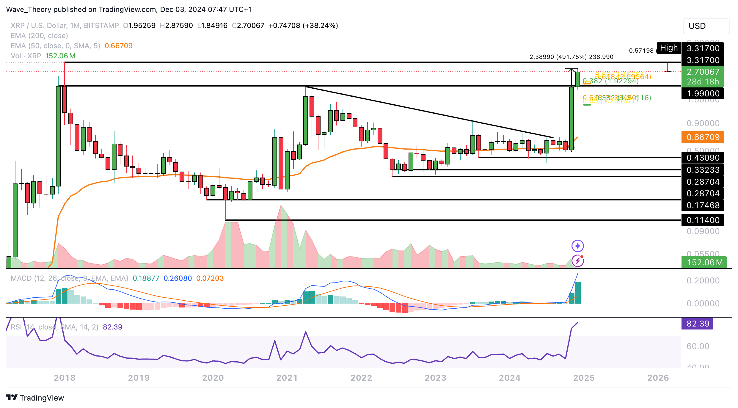 Damit befindet sich Ripple jetzt an wichtigem Widerstandsbereich, welcher sich von 1,99 USD und 3,317 USD erstreckt. So könnte Ripple bald das Bitstamp-ATH von rund 3,32 USD erreichen oder gar übertreffen.