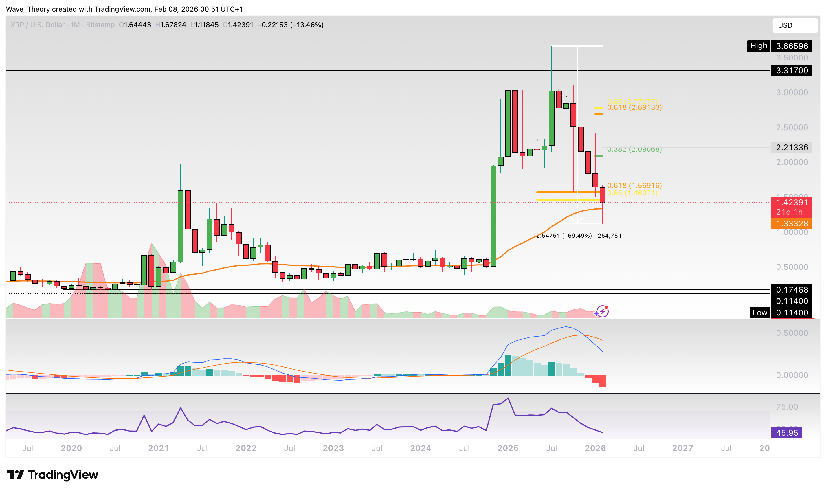 Seit des ATHs bei rund 3,66 USD ist der Ripple Kurs bereits um rund 70 % gefallen. Dabei stößt er jetzt zwischen dem 50-Monate-EMA bei rund 1,33 USD und der Golden Ratio Unterstützung bei rund 1,56 USD auf signifikante Unterstützung.