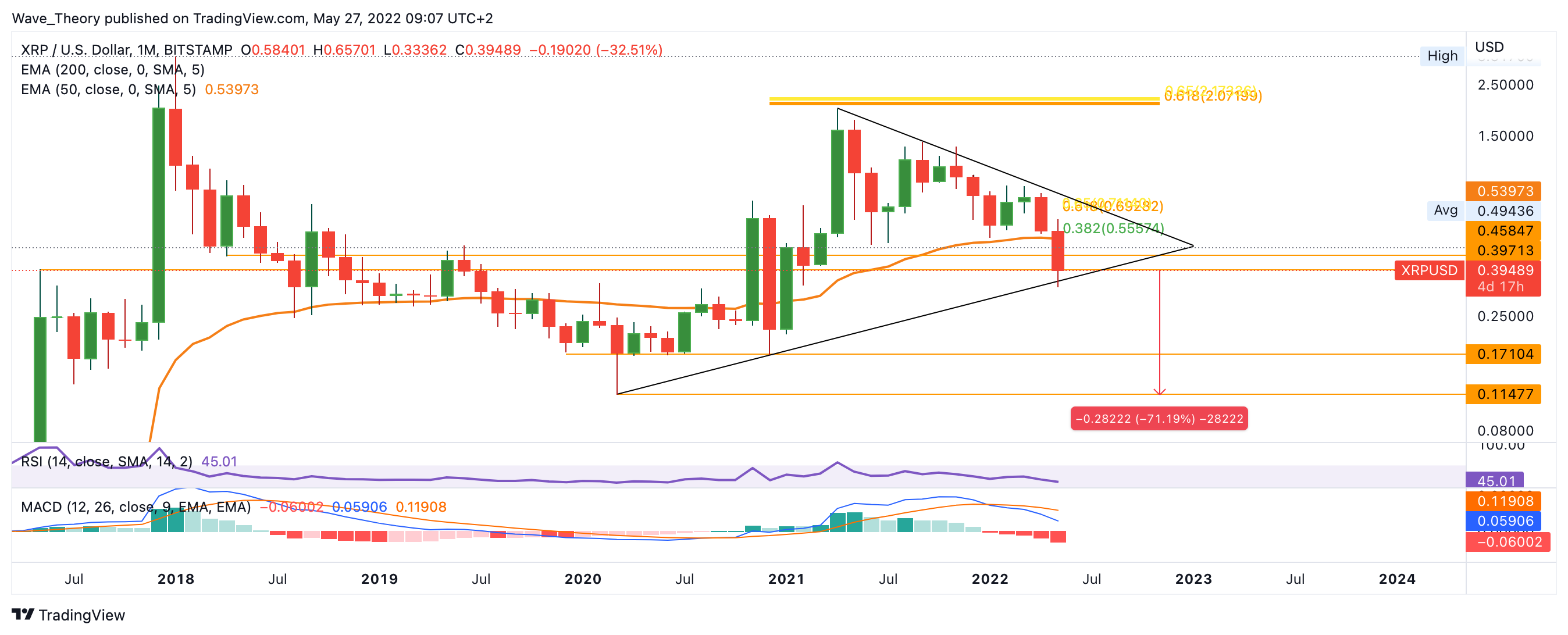 Sollte der Ripple Kurs bärisch ausbrechen, warten zwischen 0,11 – 0,17 USD wichtige Unterstützung auf den XRP Kurs. Das impliziert ein Abwärtspotenzial von rund 71 %.