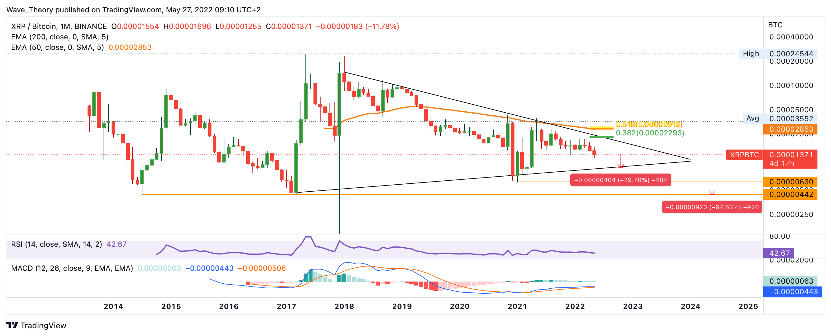 Auch gegen BTC setzt der XRP Kurs den Abwärtstrend fort, nachdem Ripple vor einigen Monaten am 0,382 Fib Widerstand bei rund 0,000023 BTC bärisch abgewiesen wurde. Ripple könnte jetzt rund 30 % fallen, um zur Trendlinie des symmetrischen Dreiecks zurückzukehren. Ansonsten warten spätestens 68 % tiefer vom aktuellen Preisniveau signifikante Unterstützung zwischen 0,0000044 bis 0,0000063 BTC auf den Ripple Preis.