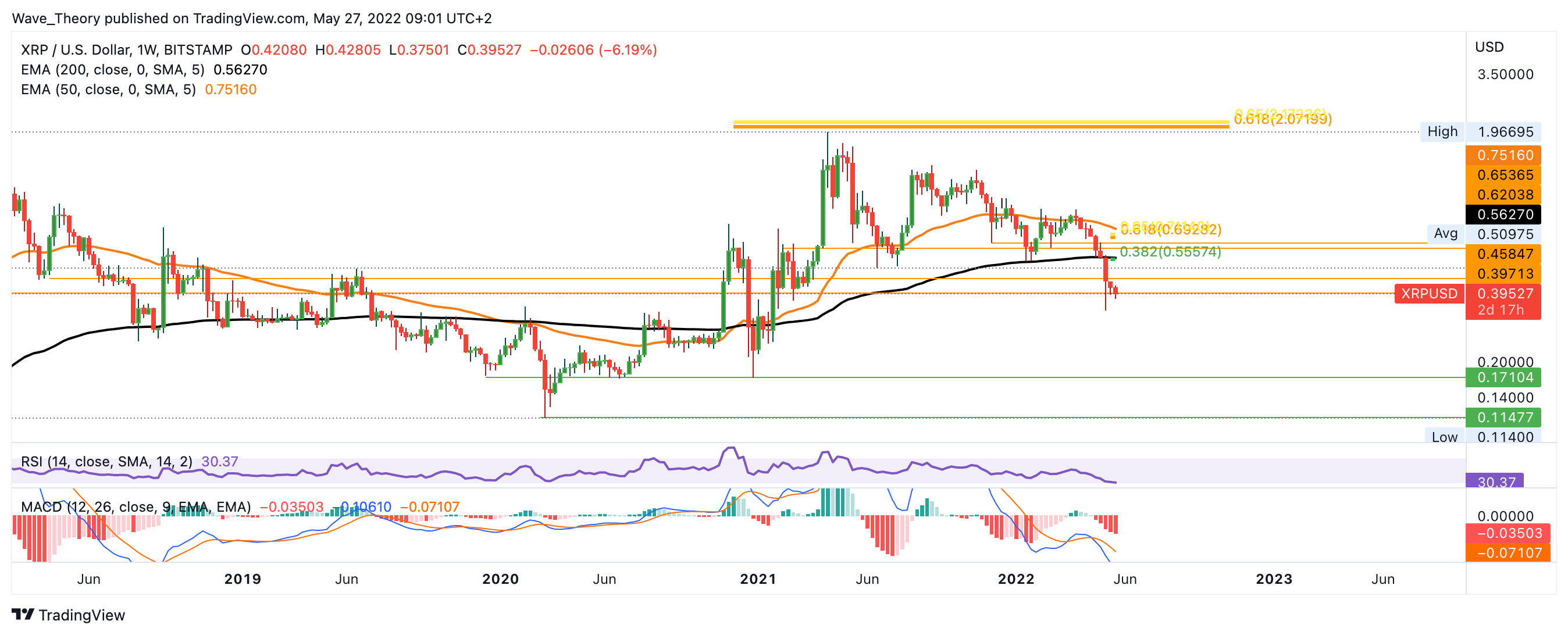 Lediglich der MACD zeigt sich eindeutig bärisch, denn die MACD Linien sind bärisch überkreuzt und das Histogramm tickt bärisch tiefer. Um wieder bullisch zu werden, müsste Ripple den Widerstand bei rund 2,1 USD brechen. Denn selbst die immense Aufwärtsbewegung zwischen Anfang 2020 bis Mitte 2021 fand im Rahmen eines Bärentrends statt, denn XRP konnte schon damals nicht den Golden Ratio Widerstand bei rund 2,1 USD brechen. Der Ripple Kurs befindet sich nämlich seit dem Januar 2018 in einem Bärentrend, welcher noch immer nicht gebrochen ist. Denn mit dem Hochpunkt aus dem Jahr 2021 formte der Ripple Kurs einen tieferen Hochpunkt als im Jahr 2018.