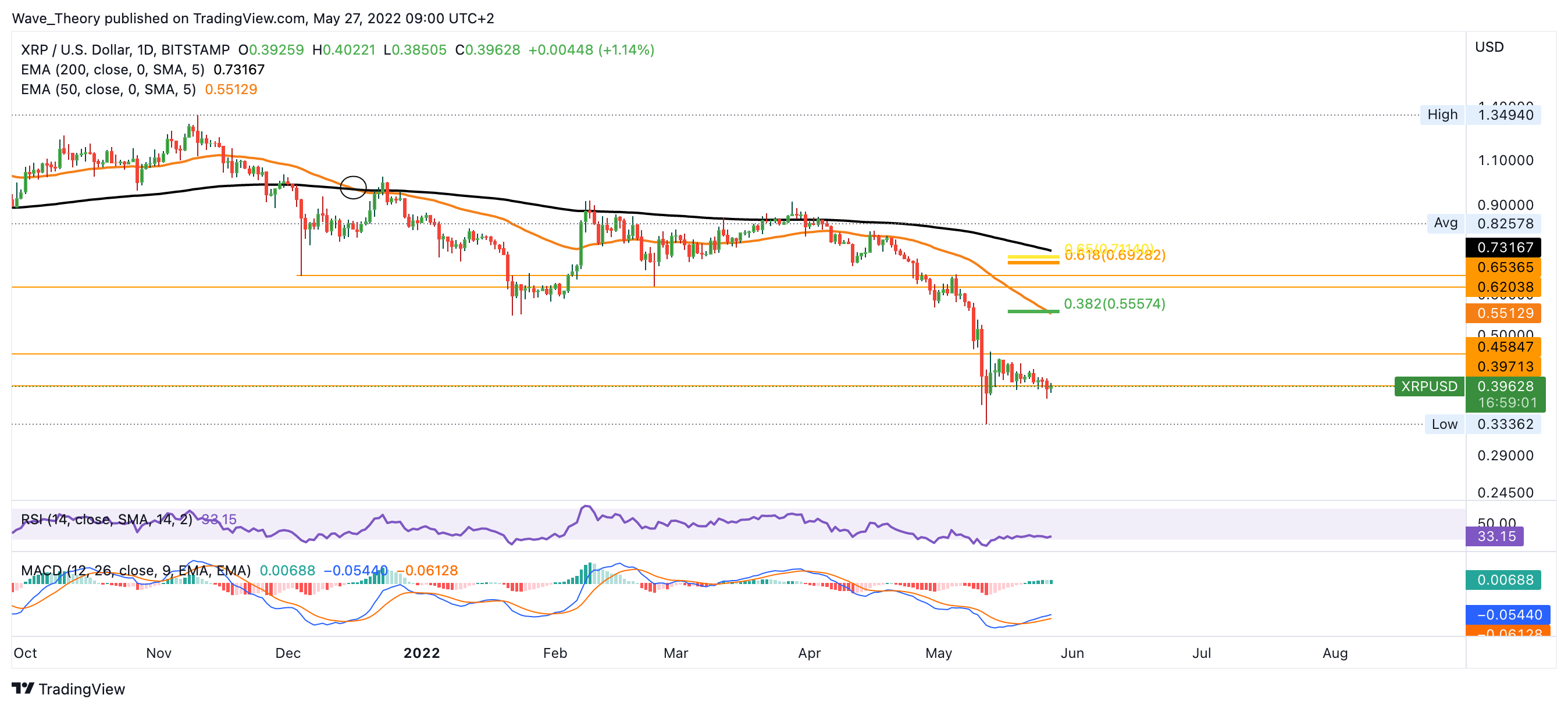 Noch befindet sich der XRP Kurs in der Unterstützungszone zwischen 0,4 – 0,46 USD. Damit besteht immer noch die Chance, dass die Unterstützungszone erfolgreich hält und sich Ripple zu den nächsten Widerständen aufmacht. Bei 0,555 USD und rund 0,7 USD stößt der XRP Kurs dann auf signifikante Fibonacci Widerstände. Außerdem stößt Ripple an diesen Preisniveaus auf die 50-Tage-und 200-Tage-EMAs, welche als zusätzliche Widerstände fungieren.