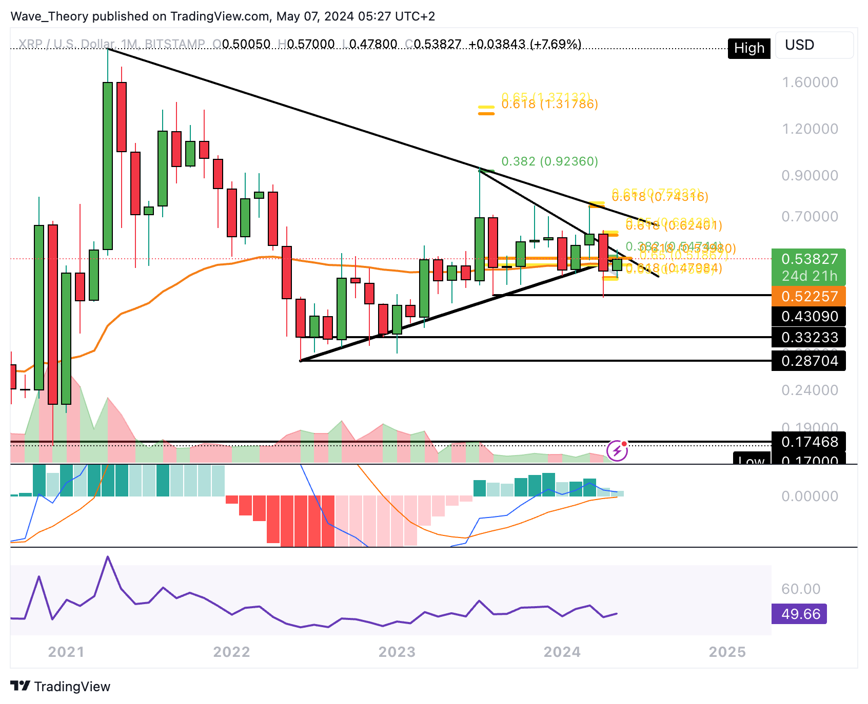XRP stößt jetzt bereits am 0,382 Fib Widerstand bei rund 0,55 USD auf signifikanten Widerstand. Dort fungiert der 50-Wochen-EMA als zusätzlicher Widerstand.