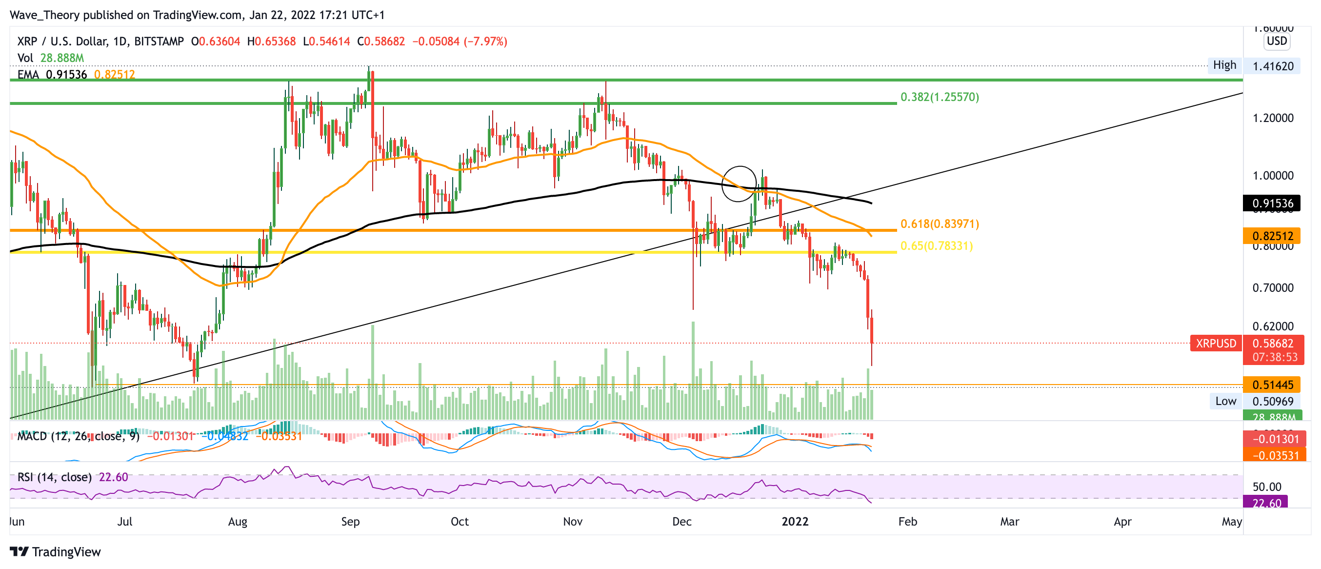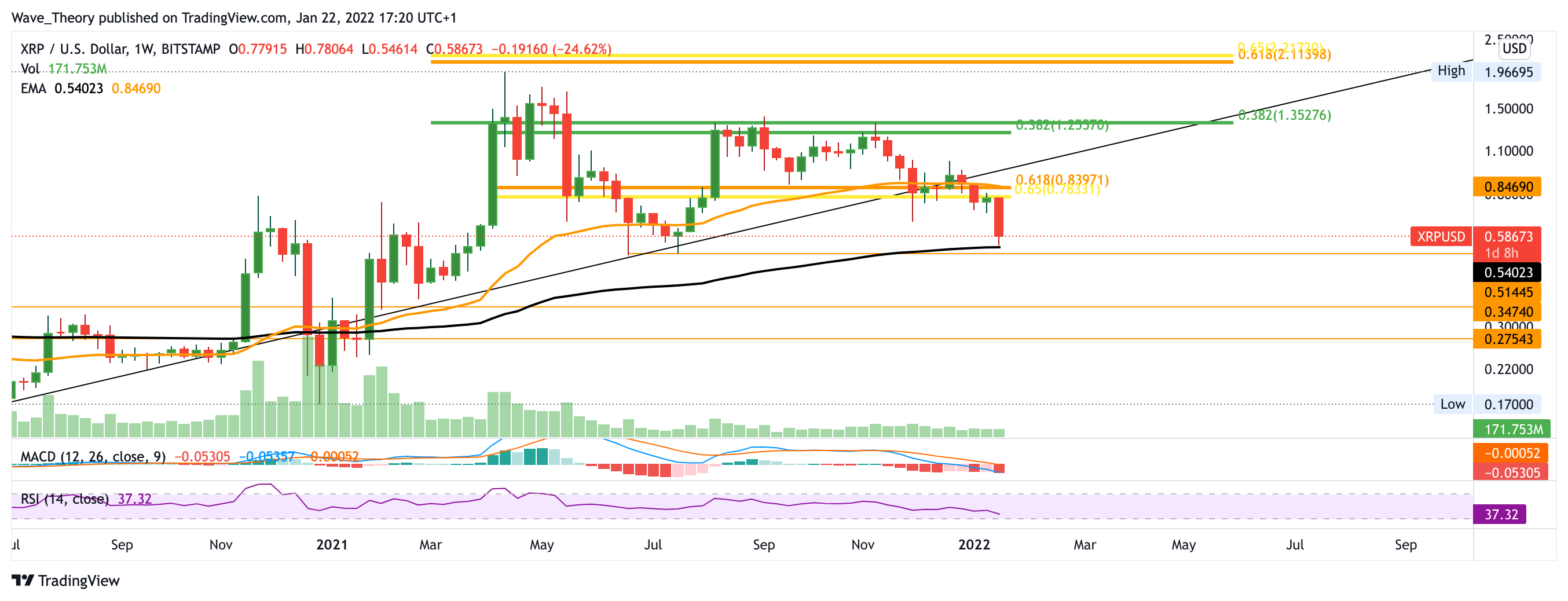 Der XRP Kurs erreichte in diesem Bullenzyklus seinen Höhepunkt bei rund 2 USD, wenige Prozent unter dem Golden Ratio Widerstand bei 2,1 USD. Daraufhin kehrte der Ripple Kurs zur historischen Unterstützung bei 0,52 USD zurück, woran der Ripple Kurs sehr stark abprallte. Jedoch wurde XRP anschließend am 0,382 Fib Niveau bei rund 1,35 USD abgewiesen, womit der XRP Kurs nun erneut im Begriff ist, die Unterstützung bei 0,52 USD zu erreichen. Dort eilt zusätzlich der 50-Monate-EMA zu Unterstützung. An diesem Preisniveau könnte der XRP Kurs sehr stark abprallen, um bis rund 1,1 USD zu steigen. Dort stößt der Ripple Kurs dann auf seinen nächsten signifikanten Fib Widerstand. Ansonsten zeigt sich der MACD im Monatskurs bärisch: Die MACD Linien überkreuzen sich bärisch während das Histogramm tiefer tickt. Auch das Handelsvolumen hat stark abgenommen.