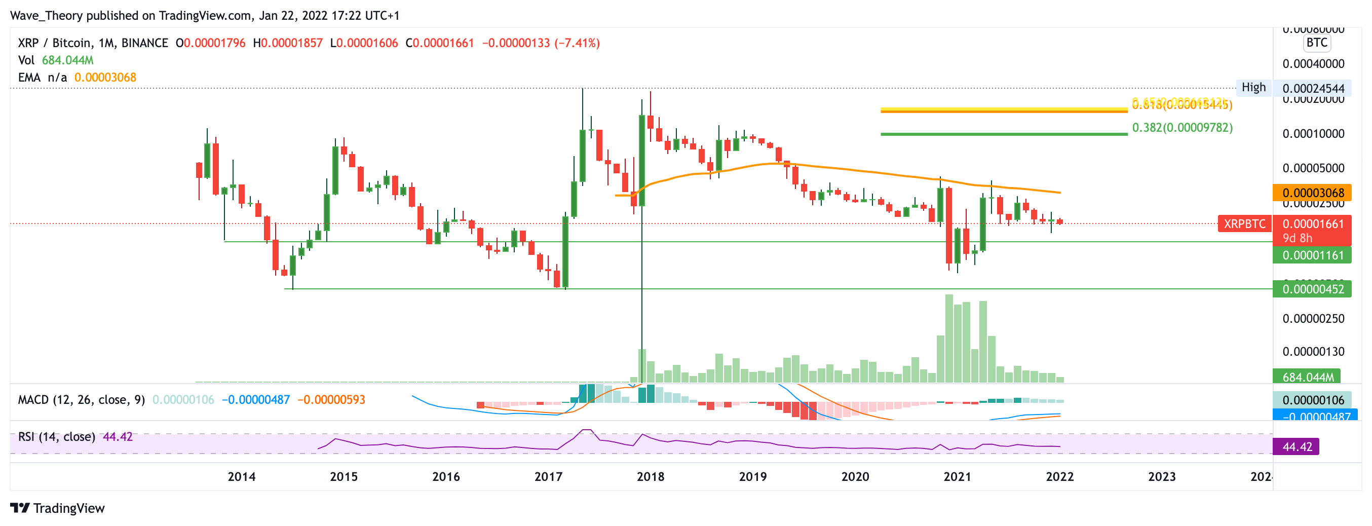 Gegen BTC ist der XRP Kurs sehr weit weg entfernt von seinen Fibonacci Widerständen. Aktuell schafft es XRP nicht einmal, dne 50-Monate-EMA zu überwinden, denn daran wurde er mehrmals abgewiesen. Bei 0,0000116 BTC findet der Ripple Kurs Unterstützung. Sollte diese Unterstützung nicht halten, findet XRP spätestens an seinem Tiefpunkt bei 0,0000045 BTC Unterstützung. Hier zeigt sich der MACD im Vergleich zum USD Chart leicht weniger bärisch: Die MACD Linien sind noch bullisch überkreuzt, aber das Histogramm tickt auch hier bärisch tiefer.