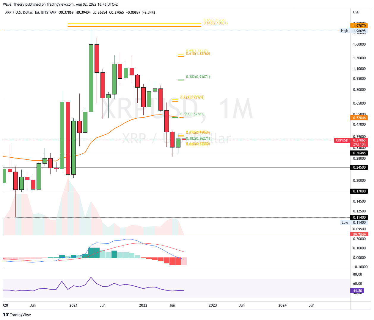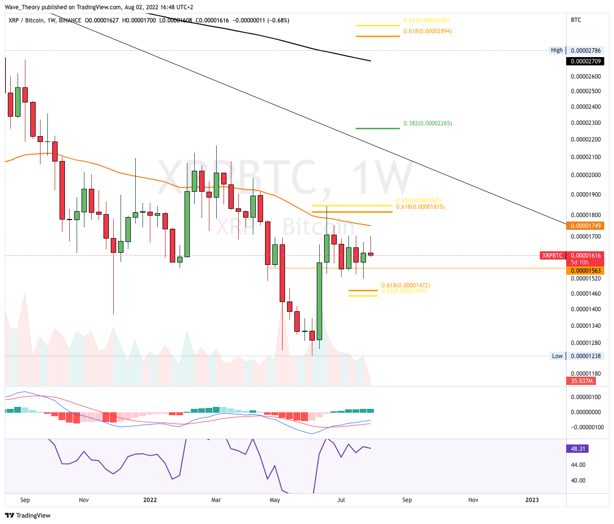 Für eine bullische Trendwende müsste der Ripple Kurs die Golden Ratio bei rund 2,2 USD brechen, woran der Ripple Kurs sogar im letzten Bullenlauf scheiterte. Der langfristige Trend von XRP bleibt also bärisch.
