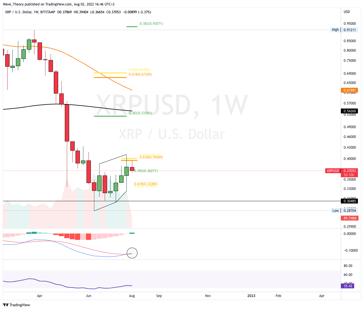 Bricht der XRP Kurs die Golden Ratio bei rund 0,4 USD, wartet bei rund 0,53 USD der nächste signifikante Widerstand, denn dort laufen 200-Wochen-EMA und 0,382 Fib Niveau zusammen.