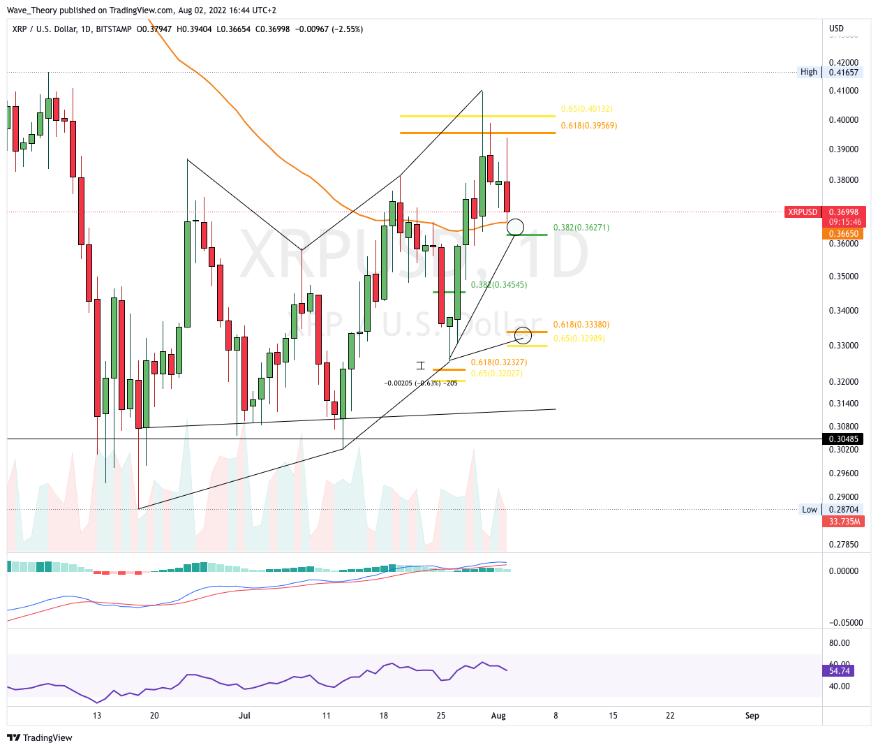 Aber auch wenn der Ripple Kurs die 0,382 Fib Unterstützung bei rund 0,3665 USD bärisch bricht und zur Golden Ratio Unterstützung bei rund 0,33 USD korrigiert, würde der Ripple Kurs damit einen höheren Tiefpunkt etablieren.