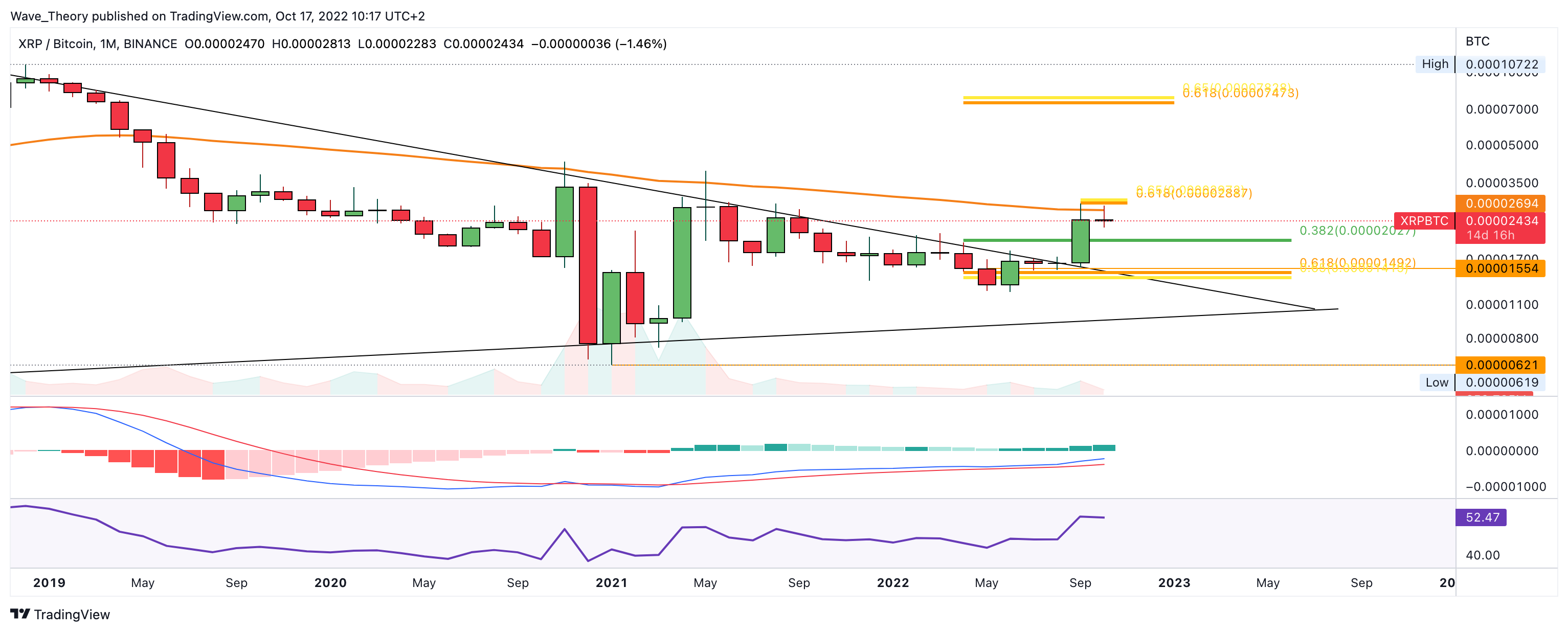 Gegen BTC konnte der Ripple Kurs bereits letzten Monat bullisch ausbrechen. Anschließend stieß der XRP Kurs aber am Golden Ratio Widerstand bei rund 0,000029 BTC auf bärische Ablehnung. Darüber hinaus dient der 50-Monate-EMA an diesem Preisniveau als zusätzlicher Widerstand.