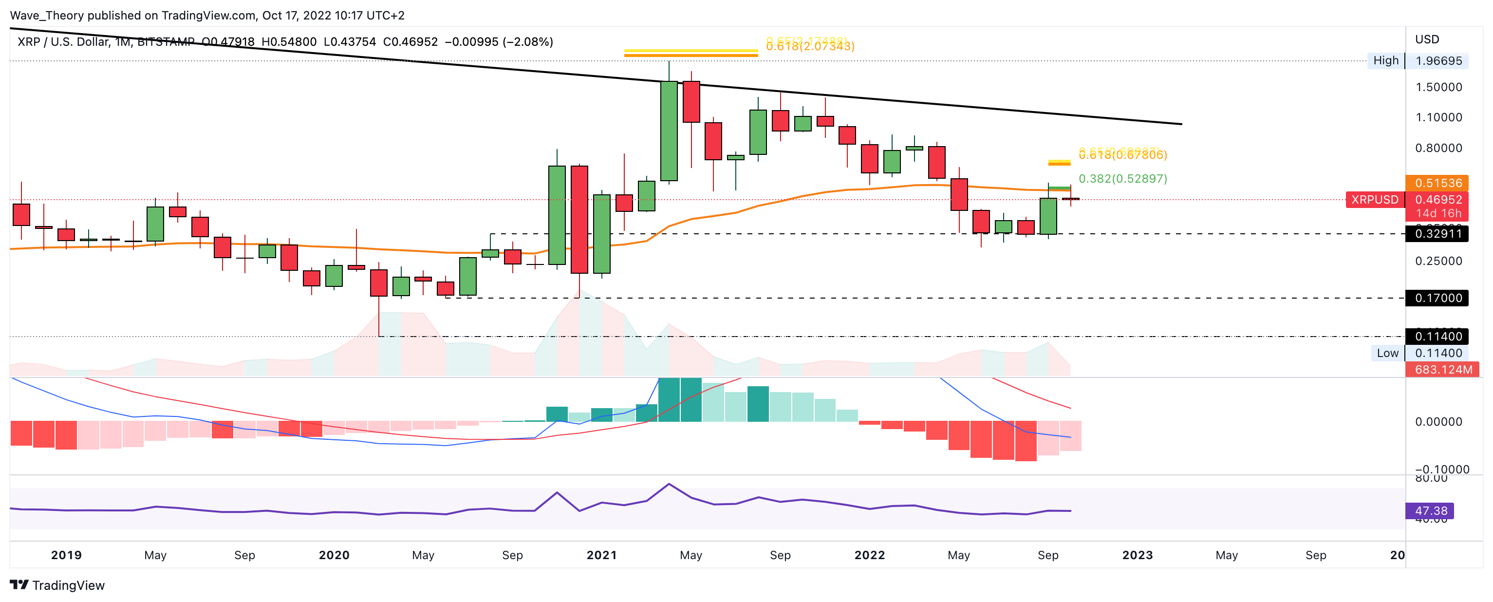 Im Monatschart tickt das Histogramm des MACDs seit letztem Monat bullisch höher, was ein bullisches Zeichen ist. Jedoch scheint XRP dennoch am 50-Monate-EMA bei rund 0,515 USD bärisch abgewiesen zu werden.