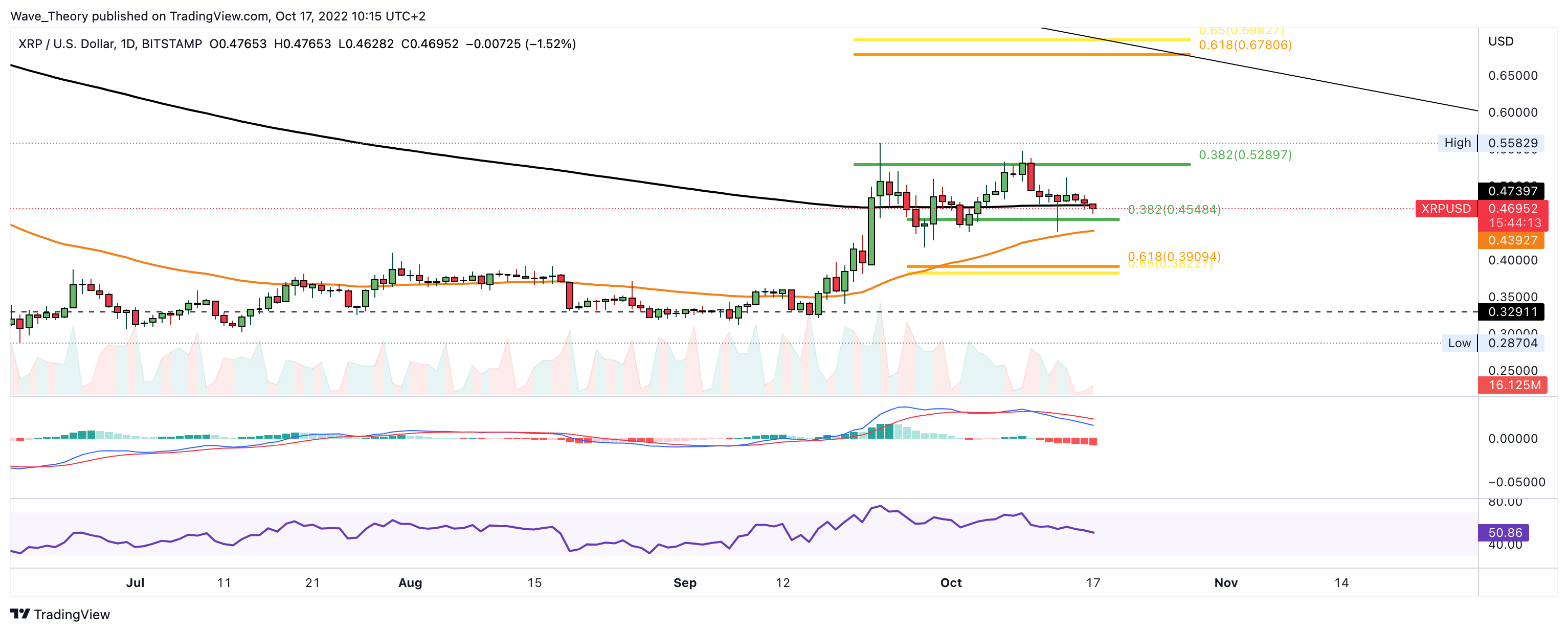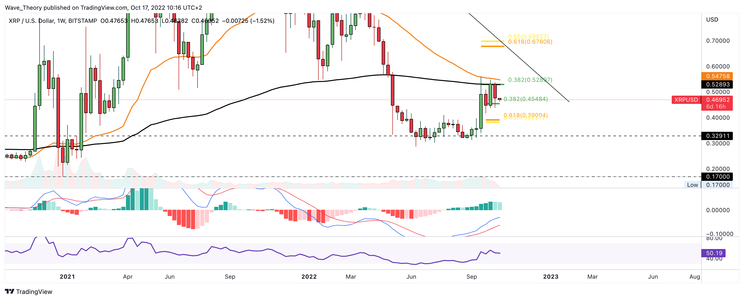 Der Ripple Kurs schaffte es nicht, den 50-Wochen-EMA bei rund 0,55 USD zu überwinden. Damit bleibt auch der nächste Widerstand der Golden Ratio bei rund 0,68 USD unerreicht.