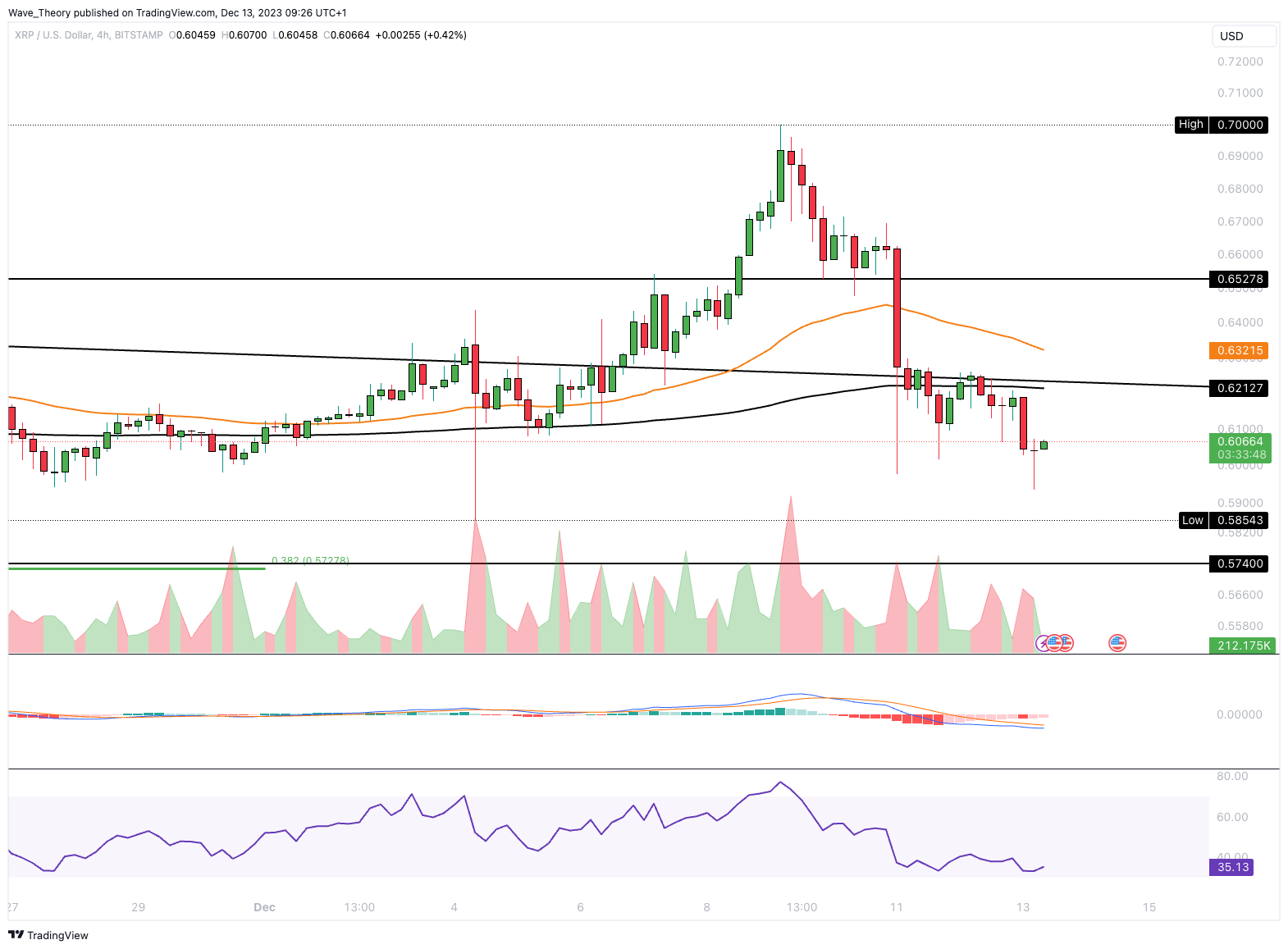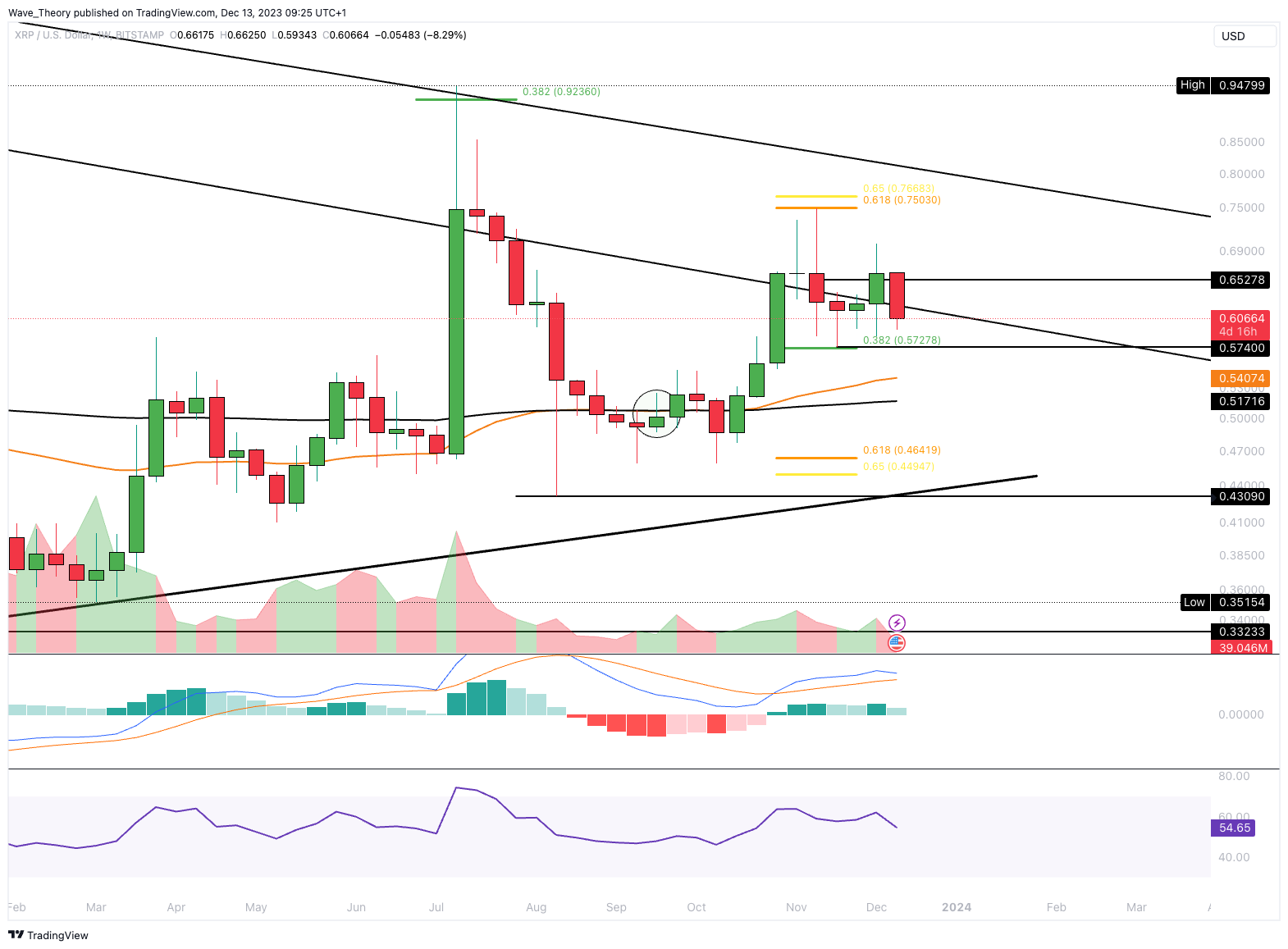 Wenn die 0,382 Fib Unterstützung bei rund 0,573 USD nicht hält, könnte Ripple zur Golden Ratio bei rund 0,46 USD korrigieren.