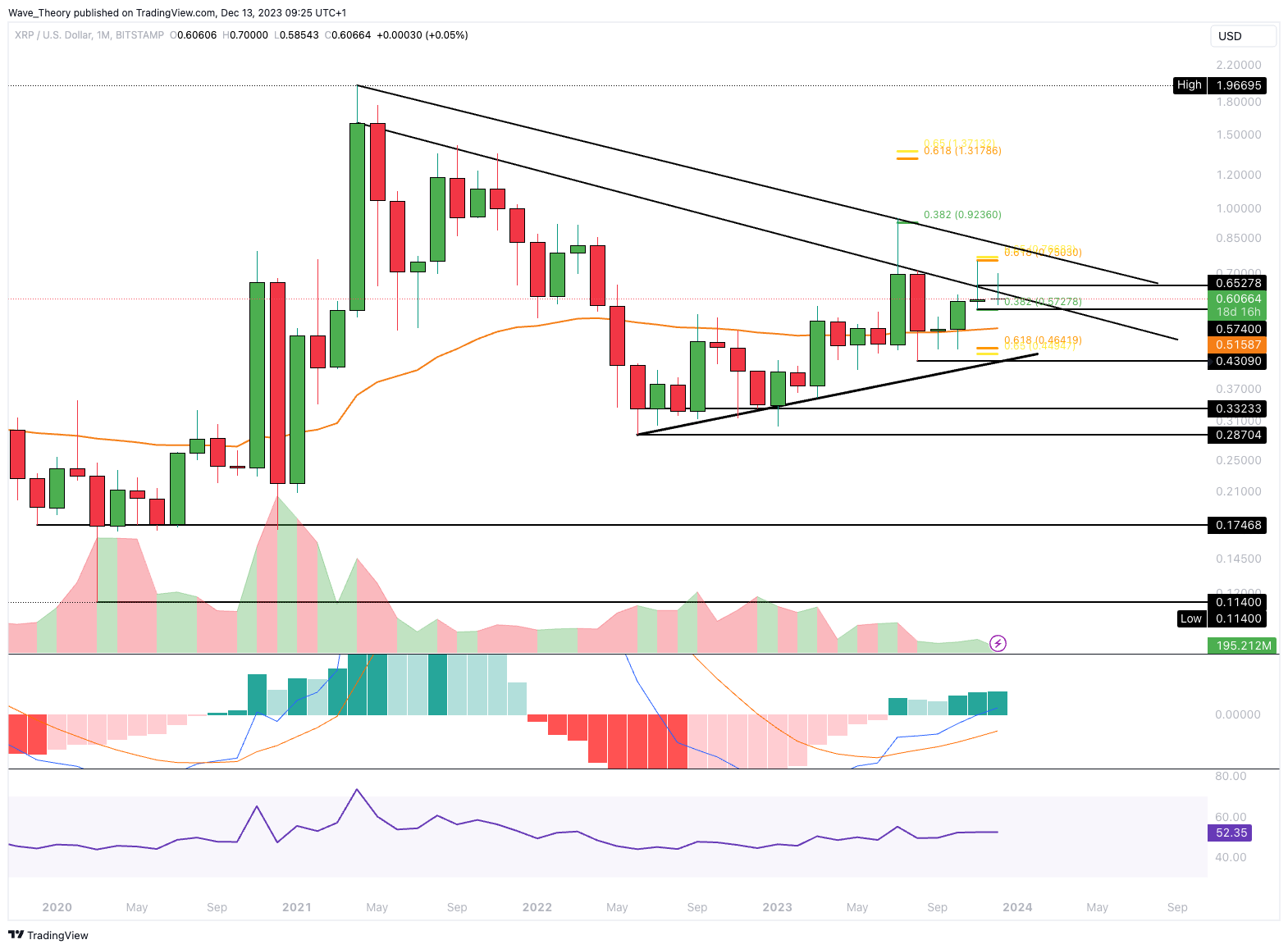 Letzten Monat wurde Ripple am Golden Ratio Niveau bei rund 0,75 USD bärisch abgewiesen. Anschließend setzte der Kurs zur Korrektur an, woraufhin der Kurs an der 0,382 Fib Unterstützung bei rund 0,573 USD korrigierte.