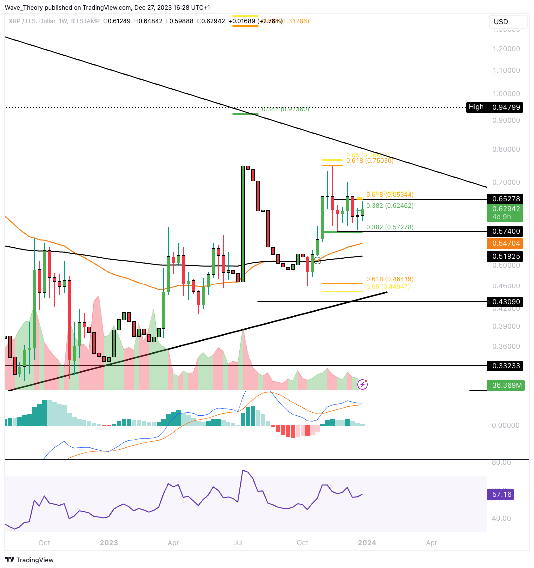 Der XRP Kurs hält sich bisher erfolgreich über der 0,382 Fib Unterstützung bei rund 0,573 USD