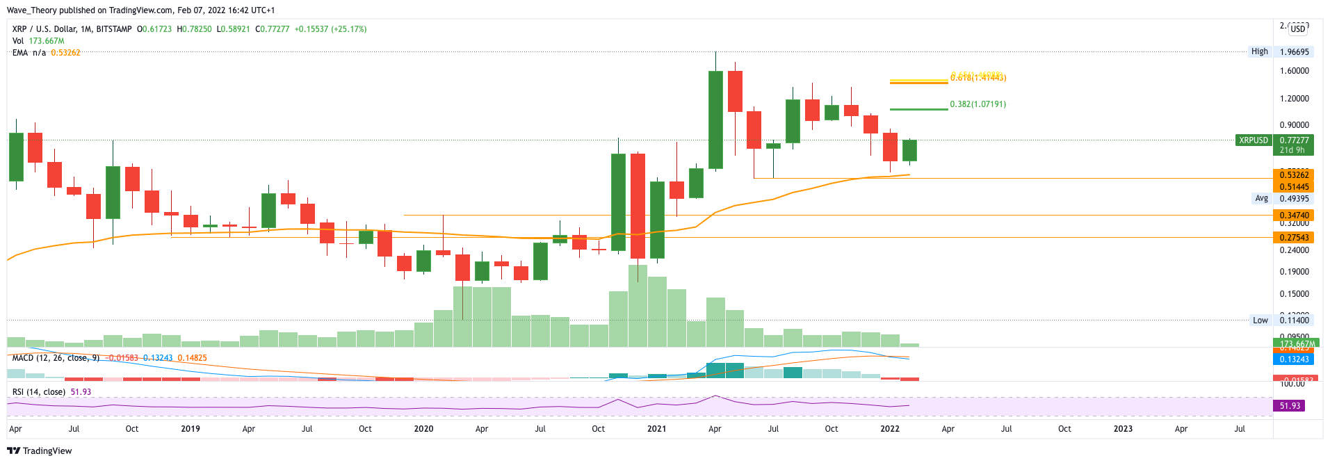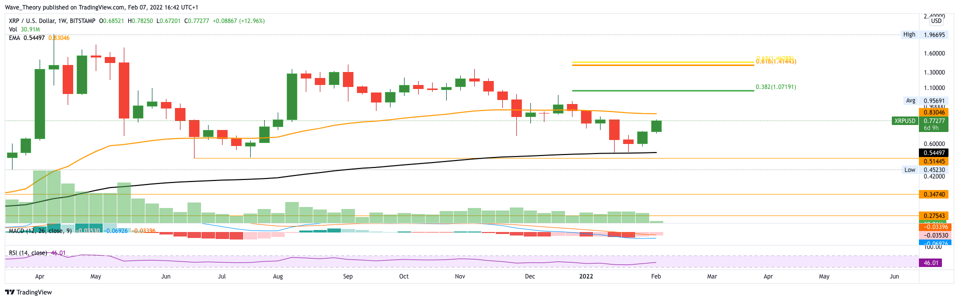 Im Wochenkurs wird ersichtlich, dass der 200-Wochen-EMA dem 50-Monate-EMA zuvor kam und als signifikante Unterstützung dienen konnte. Daran, bei rund 0,55 USD, konnte der XRP Kurs sehr stark abprallen. Damit warten nun einige Widerstände auf den Ripple Kurs. Den ersten Widerstand findet Ripple am 50-Wochen-EMA bei rund 0,83 USD. Sollte XRP diesen brechen, könnte der XRP Preis zum 0,382 Fib Niveau bei rund 1 USD steigen. Bricht der Ripple Kurs auch diesen, könnte er zur Golden Ratio bei rund 1,5 USD steigen. Erst wenn dieses Preisniveau gebrochen ist, kann der XRP Kurs einen bullischen Trendwechsel vollziehen und neue Hochpunkte anstreben. Bis dahin befindet sich Ripple immer noch in einer Korrekturphase. Aktuell stehen die Chancen dennoch ganz gut, dass Ripple zumindest die erste Hürde hinter sich lässt und den 50-Wochen-EMA bullisch durchbricht. Schließlich entwickelt sich das Histogramm des MACDs seit letzter Woche bullisch.