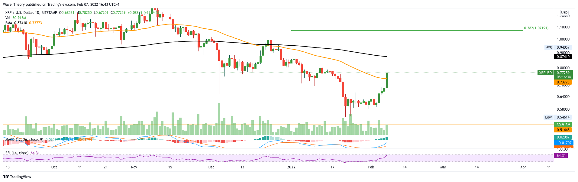 Auch im Tageskurs sieht es aktuell sehr gut aus für den XRP Kurs: die MACD Linien sind bullisch überkreuzt und das Histogramm tickt sukzessive bullisch höher. Der 50-Tage-EMA Widerstand konnte dabei bereits überwunden werden. Sollte XRP seinen Aufwärtstrend fortsetzen, dann ist seine Reaktion am 0,382 Fib Niveau bei rund 1 USD entscheidend. Bricht er diesen, könnte er endgültig aus der Korrekturphase ausbrechen und die Golden Ratio bei rund 1,5 USD anvisieren. Bricht Ripple auch diesen Widerstand, so kann er einen bullischen Trendwechsel vollziehen und sich zu neuen ATHs aufmachen. Sollte XRP jedoch auf bärische Ablehnung stoßen, so findet er spätestens bei rund 0,5 USD signifikante Unterstützung.