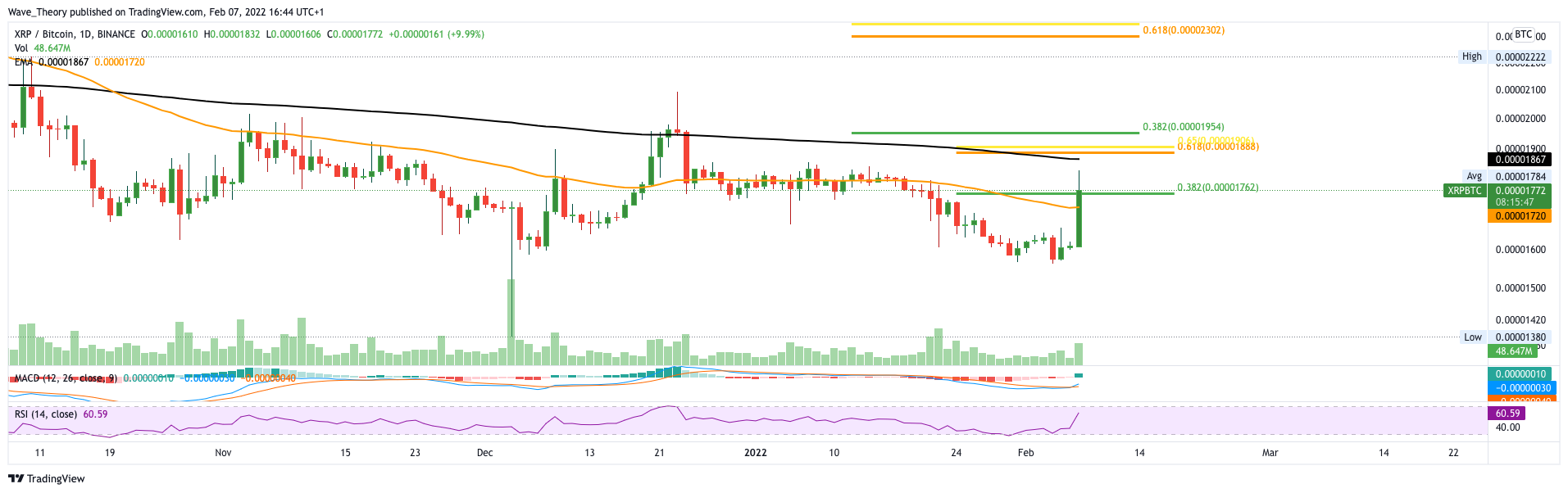 Gegen BTC entwickelt sich das Histogramm des MACDs ebenfalls bullisch und auch die MACD Linien vollziehen eine bullische Überkreuzung. Aktuell stößt der XRP Preis am 0,382 Fib Niveau bei rund 0,000018 BTC auf Widerstand. Sollte XRP diesen Widerstand überwinden, stößt er spätestens am 200-Tage-EMA, an der Golden Ratio bei rund 0,000019 BTC signifikanten Widerstand.
