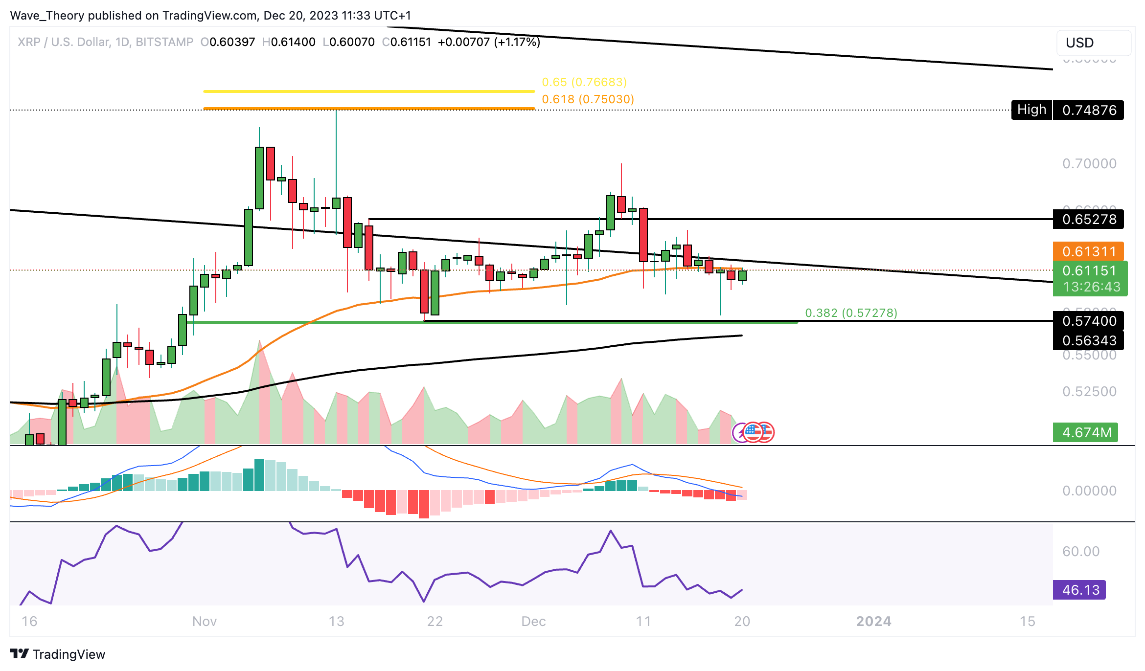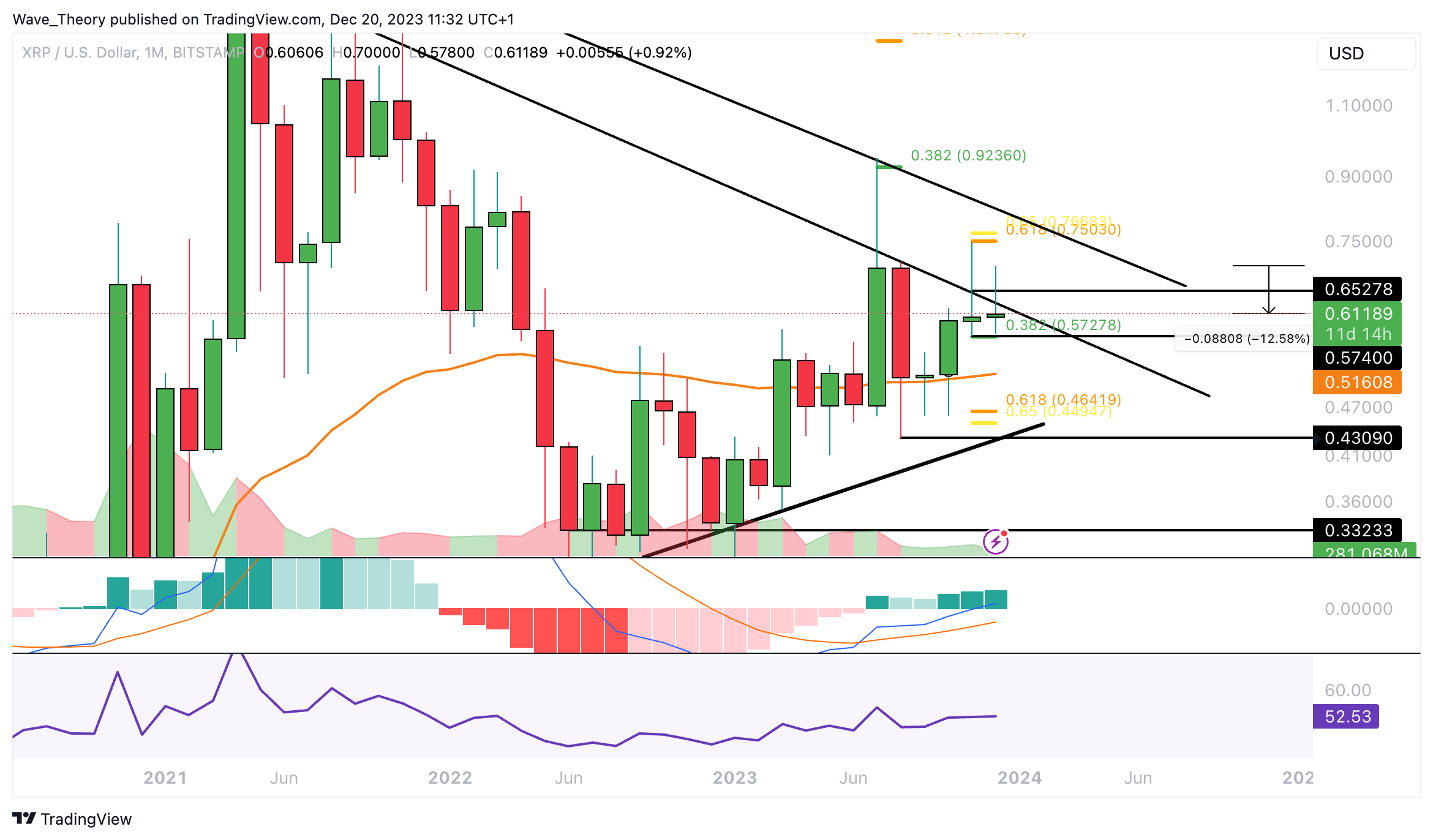 Letzten Monat wurde Ripple am Golden Ratio Widerstand bei rund 0,75 USD bärisch abgewiesen. Anschließend konnte Ripple zwar zunächst an der 0,382 Fib Unterstützung bei rund 0,572 USD abprallen.