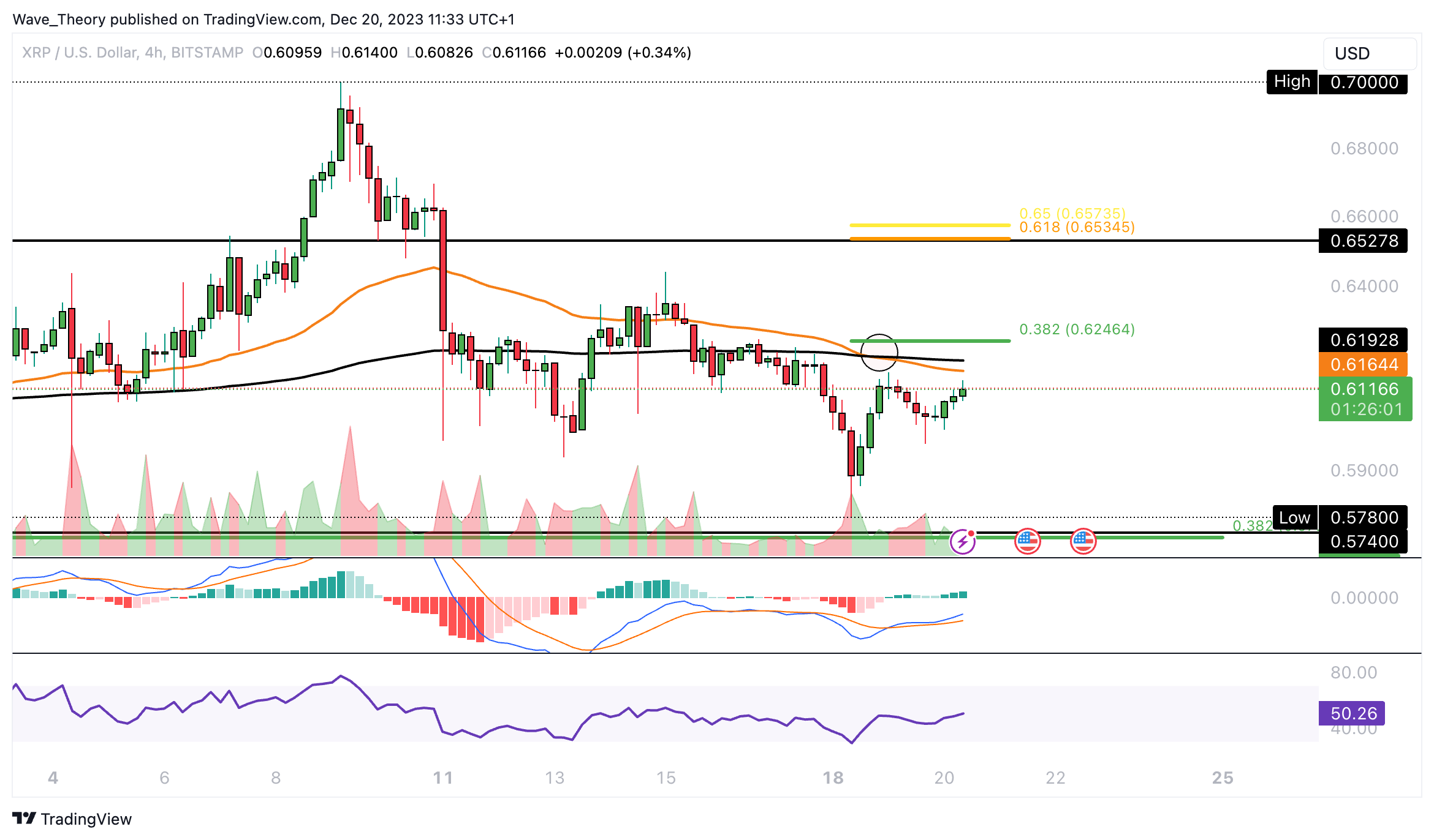 SponsoredJedoch beginnt das Histogramm des MACDs heute bullisch höher zu ticken. Wenn die 0,382 Fib Unterstützung bei rund 0,572 USD hält, könnte Ripple erneut den Golden Ratio Widerstand bei rund 0,75 USD anvisieren.