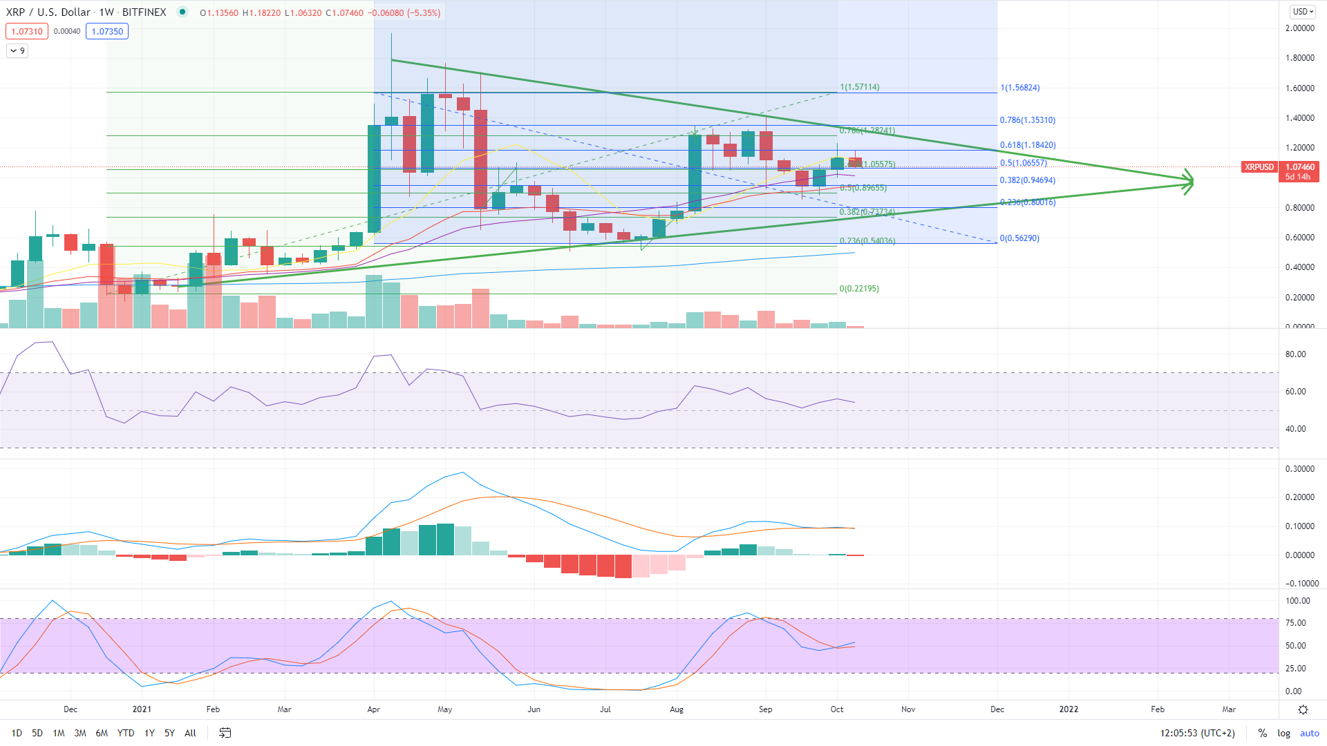 Der XRP Kurs wird also wohl innerhalb des Dreiecksmusters weiter konsolidieren. Allerdings könnte der Kurs Ende des Jahres oder 2022 über die Widerstandslinie ausbrechen und sich dann allmählich dem letzten Allzeithoch nähern.