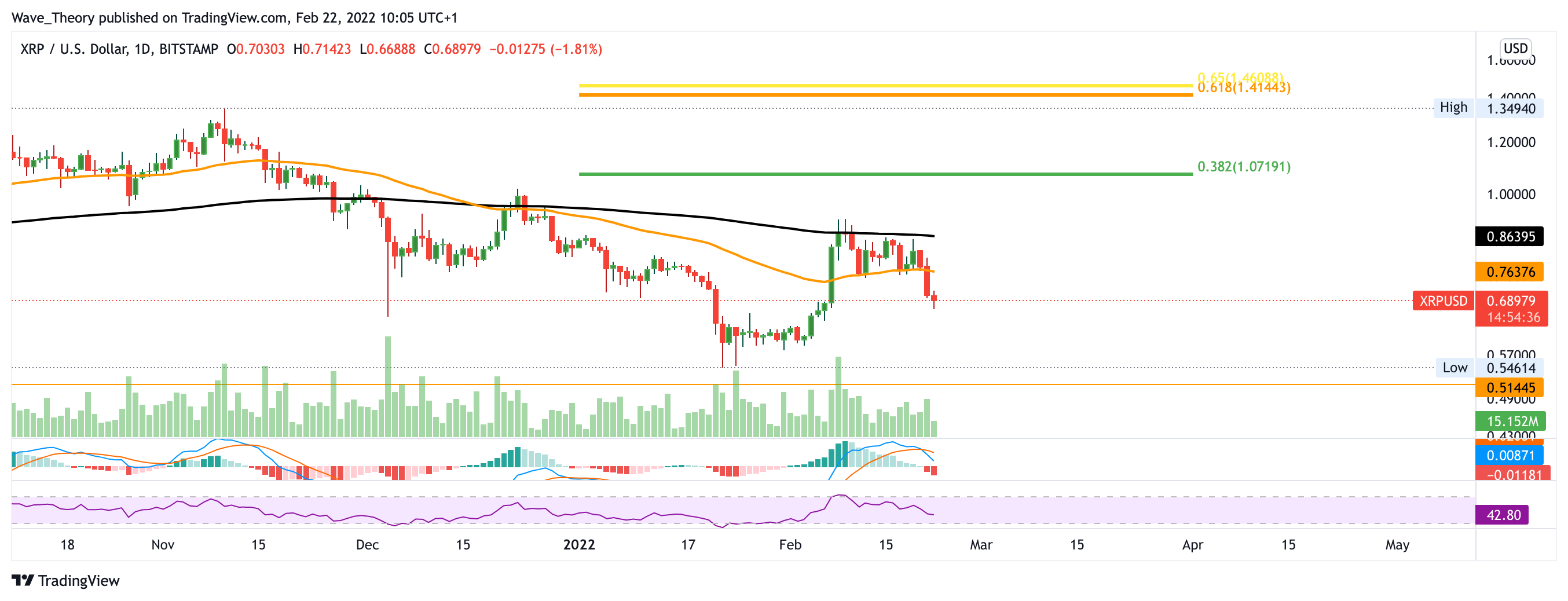 Im Tageschart ist noch immer das Death Cross intakt, was den Trend mittelfristig bärisch bestätigt. Zudem entwickelt sich das Histogramm des MACDs hier ebenfalls bärisch, während die MACD Linien bärisch überkreuzt sind. Auch hier zeigt sich der RSI neutral, jedoch könnte dieser bald überverkaufte Regionen erreichen. Sollte XRP zwischen 0,50 – 0,55 USD Unterstützung finden und nach oben abprallen, warten bereits bei rund 1,00 USD und 1,5 USD signifikante Fibonacci Widerstände auf den XRP Kurs.