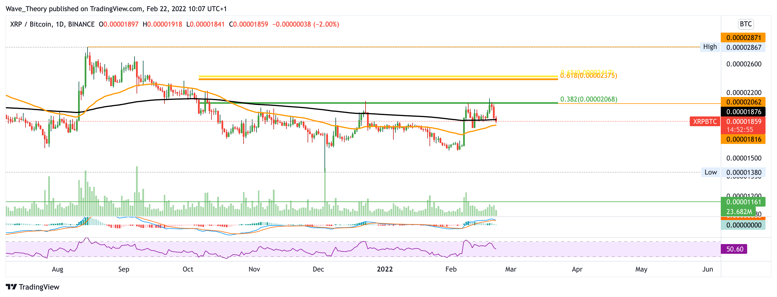 Gegen BTC gibt der Ripple Kurs jedoch bullische Hoffnung. Zwar zeigt der RSI eine bärische Divergenz und das Histogramm des MACDs tickt bärisch tiefer während die MACD Linien bärisch überkreuzt sind, jedoch stehen die EMAs kurz vor einem Golden Crossover. Sollte der Ripple Kurs das 0,382 Fib Niveau bei rund 0,000021 BTC brechen, woran er zuletzt bärisch abgewiesen wurde, findet er bei rund 0,000024 BTC den nächsten signifikanten Widerstand an der Golden Ratio. Durchbricht XRP diesen Widerstand, könnte er einen bullischen Trendwechsel vollziehen.