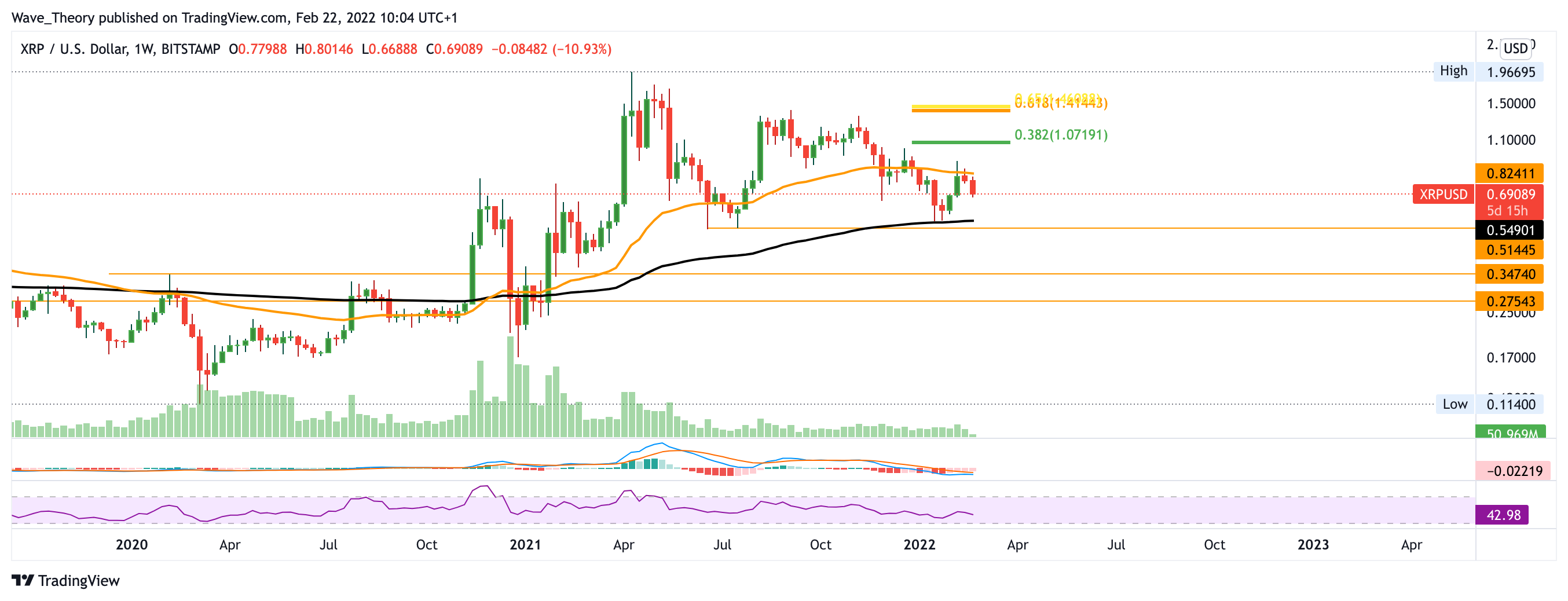 Aktuell bewegt sich der XRP Kurs zwischen dem 200-Wochen-EMA bei rund 0,55 USD, woran er zuvor Unterstützung fand, und dem 50-Wochen-EMA bei rund 0,80 USD, woran er zuletzt bärisch abgewiesen wurde. Damit scheint der Ripple Kurs nun seinen Abwärtstrend fortzusetzen und es bleibt abzuwarten, ob die Unterstützung am 200-Wochen-EMA erfolgreich halten kann oder ob sie bärisch durchbrochen wird. Sollte Ripple die Unterstützung bei 0,55 USD bärisch durchbrechen, findet er erst wieder zwischen 0,27 – 0,35 USD signifikante Unterstützung. Der wöchentliche MACD zeigt sich jedoch eher bullisch, denn die MACD Linien sind kurz vor einer bullischen Überkreuzung während das Histogramm seit einigen Wochen bullisch höher tickt.