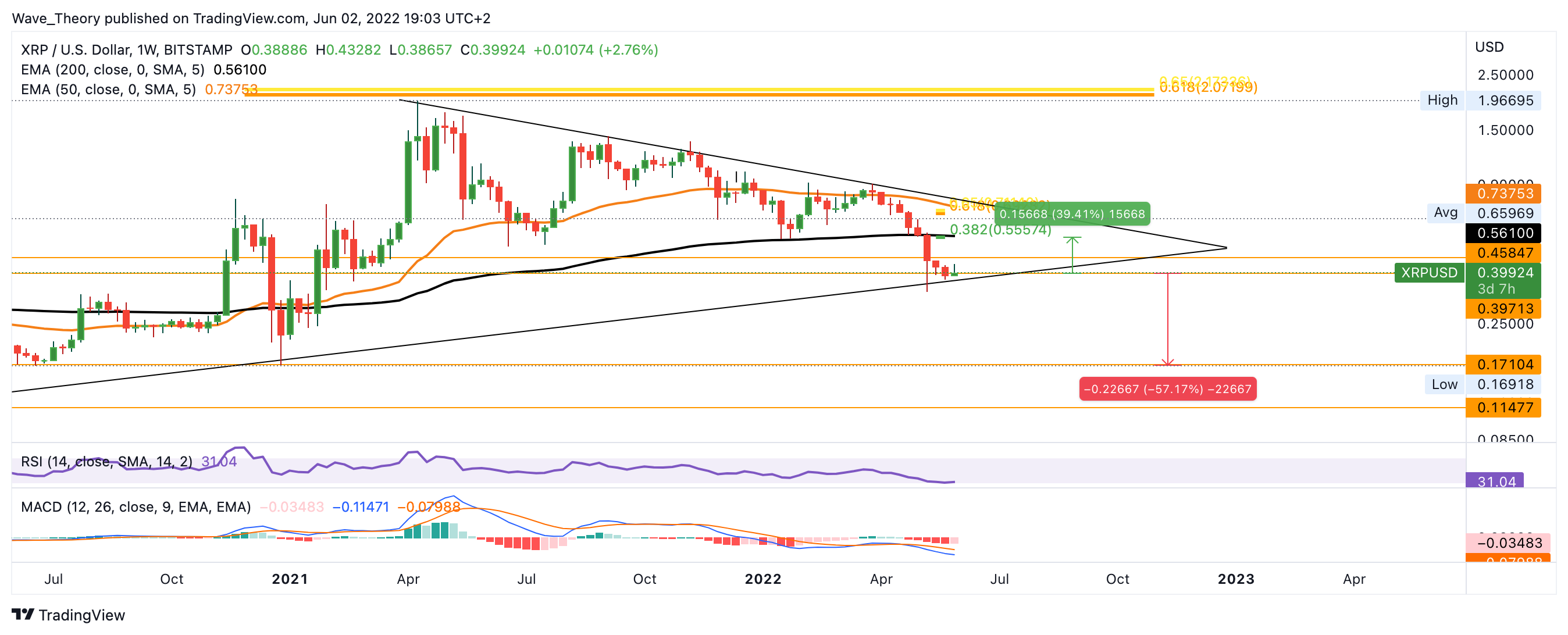 Obwohl sich die Wochenkerze zunächst eher bullisch als bärisch verhält, könnte der Ripple Kurs schon bald bärisch ausbrechen. Schließlich befindet sich XRP am unteren Ende des symmetrischen Dreiecks. Im Falle eines bärischen Ausbruchs, findet Ripple erst wieder bei rund 0,17 USD Unterstützung. Das impliziert ein Abwärtspotenzial von rund 57 %. Zudem könnte XRP sogar noch tiefer fallen, denn die Unterstützungszone erstreckt sich von 0,11 – 0,17 USD. Demnach steht aktuell ein Abwärtspotenzial von rund 57 % einem Aufwärtspotenzial von rund 39 % gegenüber.