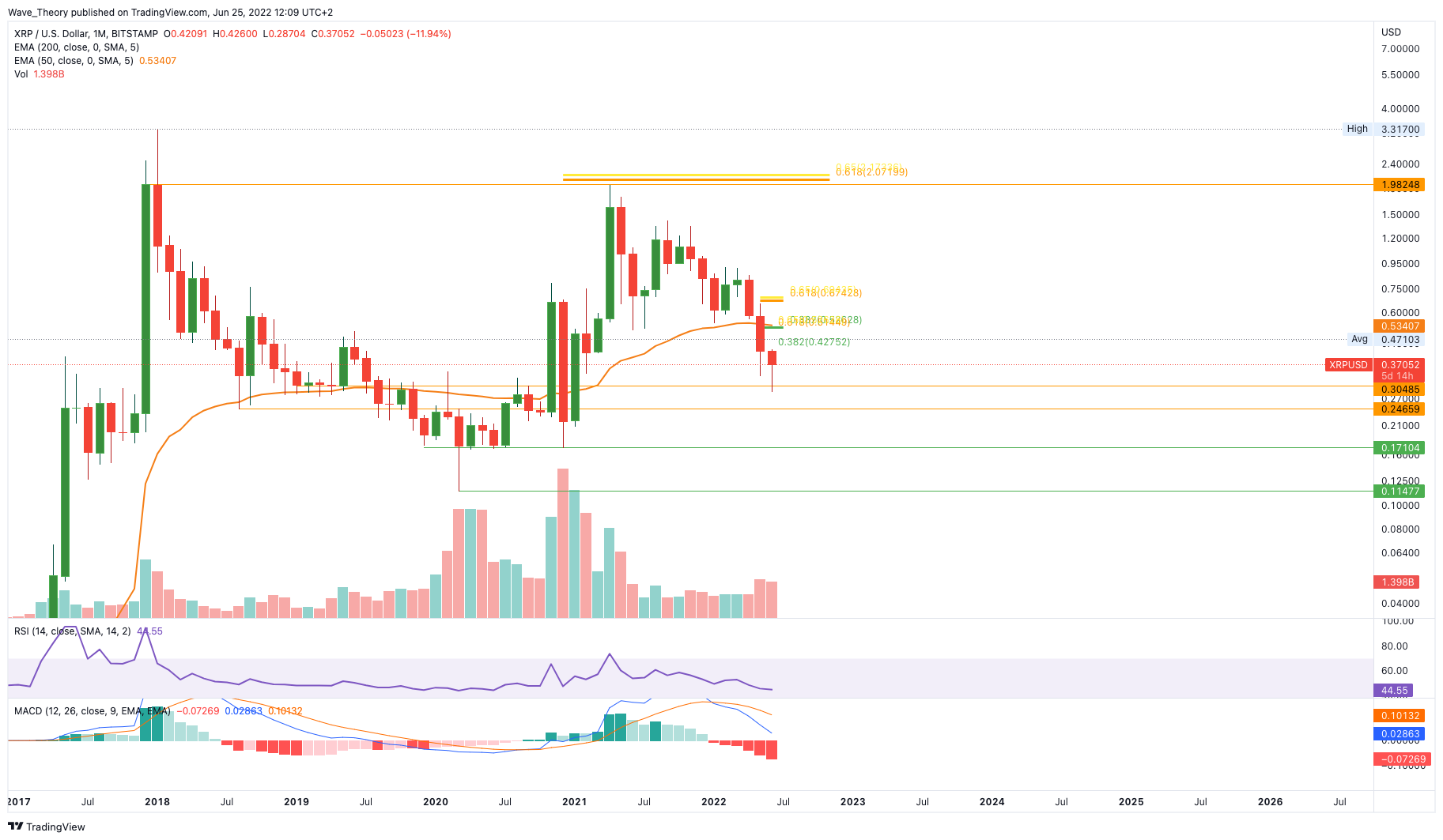 Denn XRP befindet sich seit 2018 in einem Bärentrend, welcher nicht einmal in 2021 gebrochen werden konnte. Sollte XRP an einem der Widerstände bärisch abgewiesen werden, wartet zwischen 0,25 – 0,3 USD und spätestens zwischen 0,11 – 0,17 USD signifikante Unterstützung auf Ripple.