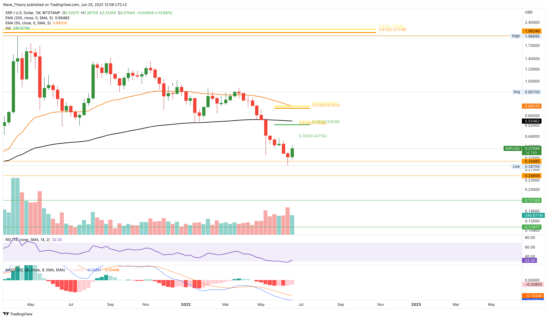 Der XRP Kurs drang in die Unterstützungszone zwischen 0,25 – 0,3 USD ein und prallte daran stark ab. Rund 35 % konnte der XRP Kurs steigen, seit Ripple rund 0,29 USD erreicht hatte. Damit befindet sich XRP nicht mehr weit entfernt vom ersten signifikanten Widerstand am 50-Tage-EMA bei rund 0,42 USD. Dort stößt XRP zudem auf signifikanten Fib Widerstand.