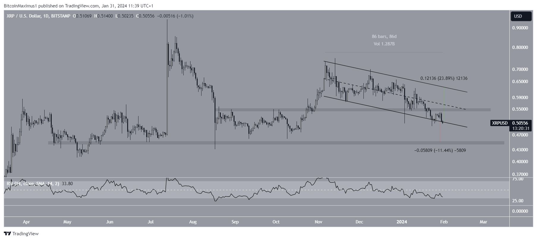 XRP ist dabei, aus einem absteigenden parallelen Kanal auszubrechen, der seit 86 Tagen besteht. Derzeit wird er sehr nahe an seiner Unterstützungslinie gehandelt. In dieser Zeit ist XRP aus dem horizontalen Bereich von 0,55 US-Dollar ausgebrochen.
